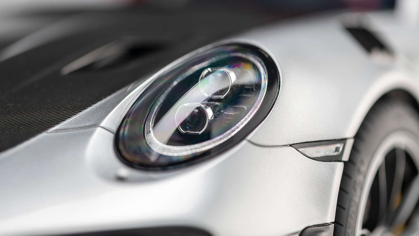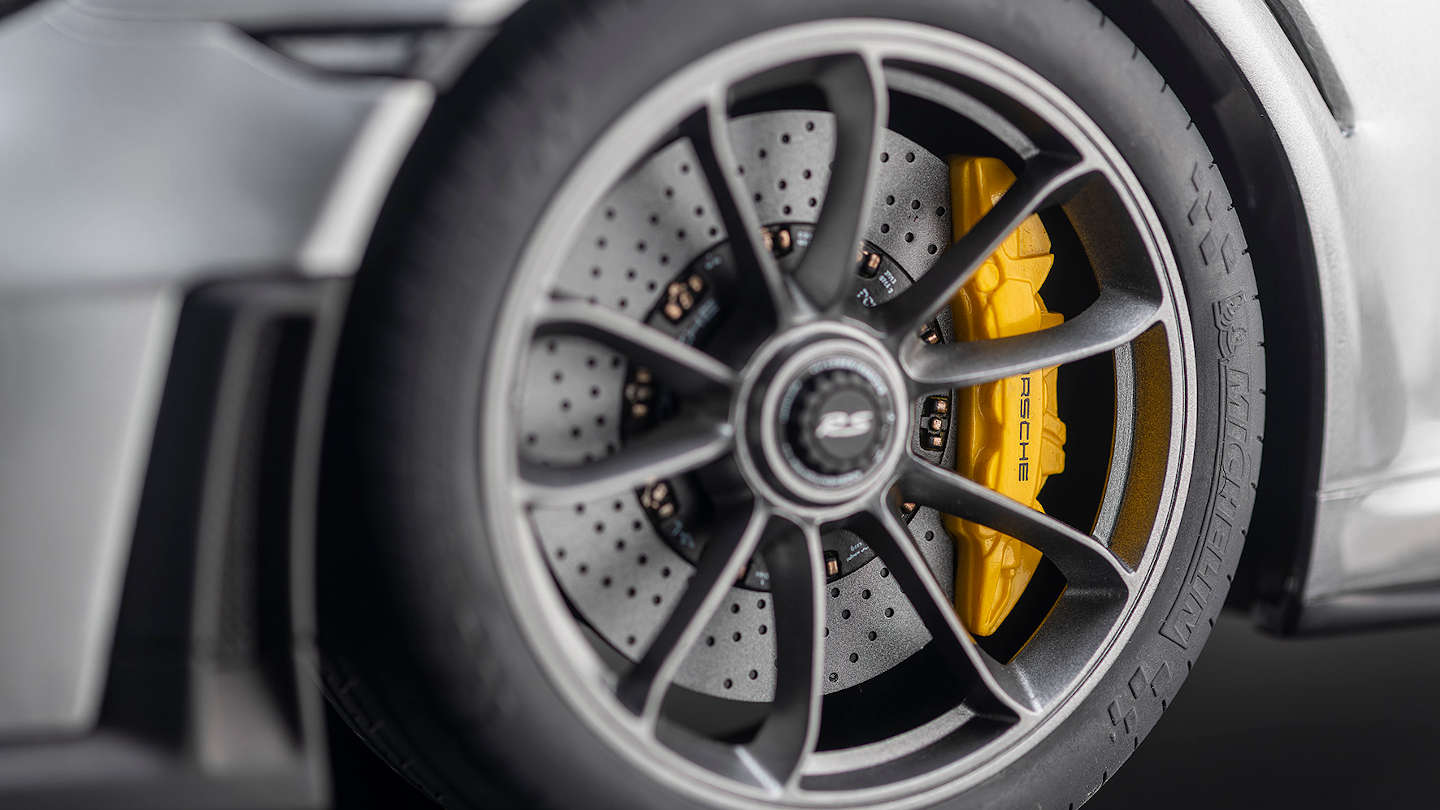 Die in Dimensionen und Profil akribisch genau nachgebauten, weichen Kautschukreifen beweisen ebenso die Exklusivität des Modells wie die Radaufhängungen aus Metall. Das repräsentative Porsche-Modell im Großmaßstab 1:8 wiegt rund zwölf Kilogramm und wird in einer Vitrine mit Acrylhaube und edler Bodenplatte ausgeliefert. Darüber hinaus garantiert eine individuell nummerierte Metallplakette mit Angabe der weltweiten Gesamtauflage die Einzigartigkeit des Modells.