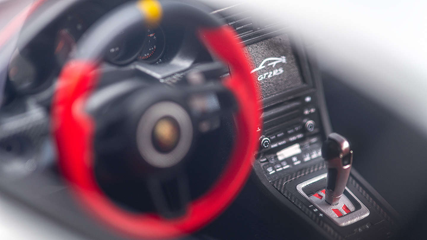 Gefertigt ist der Porsche aus hochwertigem Kunstharz, das sogar namhafte Künstler für ihre Skulpturen verwenden. Außerdem erhält die makellos glatte Oberfläche der Karosserie eine dreifache Lackierung in der Original-Porsche-Farbe. In traditioneller Modellbaukunst wird jedes der Modelle maßstabsgerecht und originalgetreu mit allen Exterieur- sowie Interieur-Details des Supersportwagens versehen. Aus diesem Grund werden auch die 69 Abziehbilddekorationen mit höchster Präzision in Handarbeit aufgebracht.