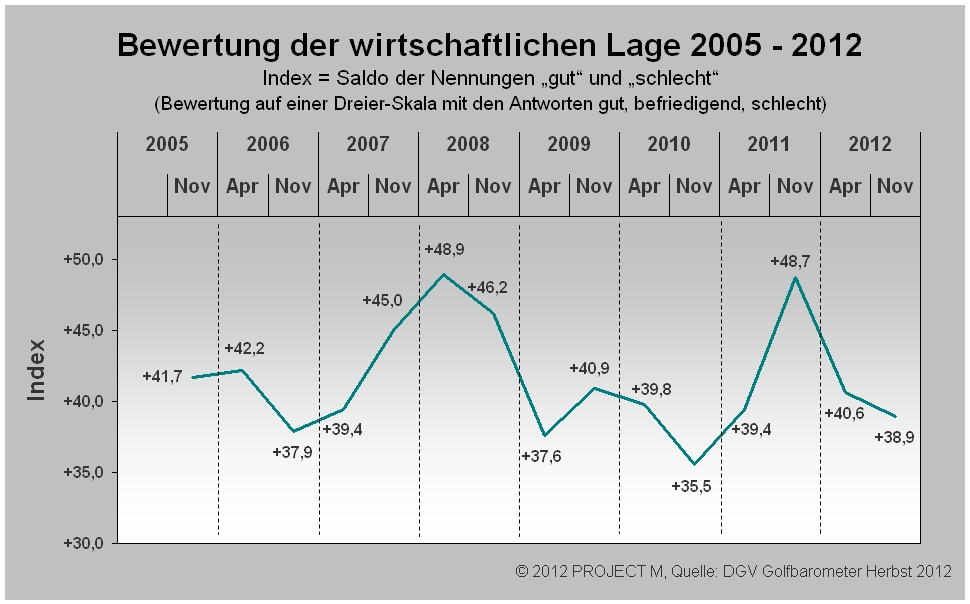 Das DGV-Golfbarometer wird jeweils zum Beginn und zum Ende der jeweiligen Golfsaison vom Deutschen Golf Verband in Zusammenarbeit mit der PROJECT M GmbH durchgeführt. Es informiert prägnant und zeitnah über die aktuellen Stimmungen und Trends in der Golfbranche. Am DGV- Herbstbarometer 2012 beteiligten sich 235 Golfanlagen, was einer Quote von fast 33 Prozent entspricht.