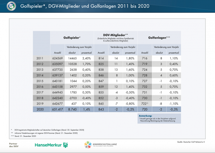 Im Rahmen einer Befragung der DGV-angehörigen Golfanlagen Ende Oktober, an der sich 41 Prozent der Golfanlagen beteiligt hatten, hatte der DGV auch nach den Erwartungen bezüglich der Mitgliederentwicklung für das Jahr 2021 gefragt. 50 Prozent der Antwortenden gehen auch 2021 von einer positiven Mitgliederentwicklung aus, insbesondere in der Altersgruppe 26 bis 49 Jahre.