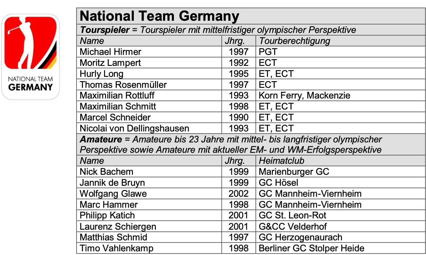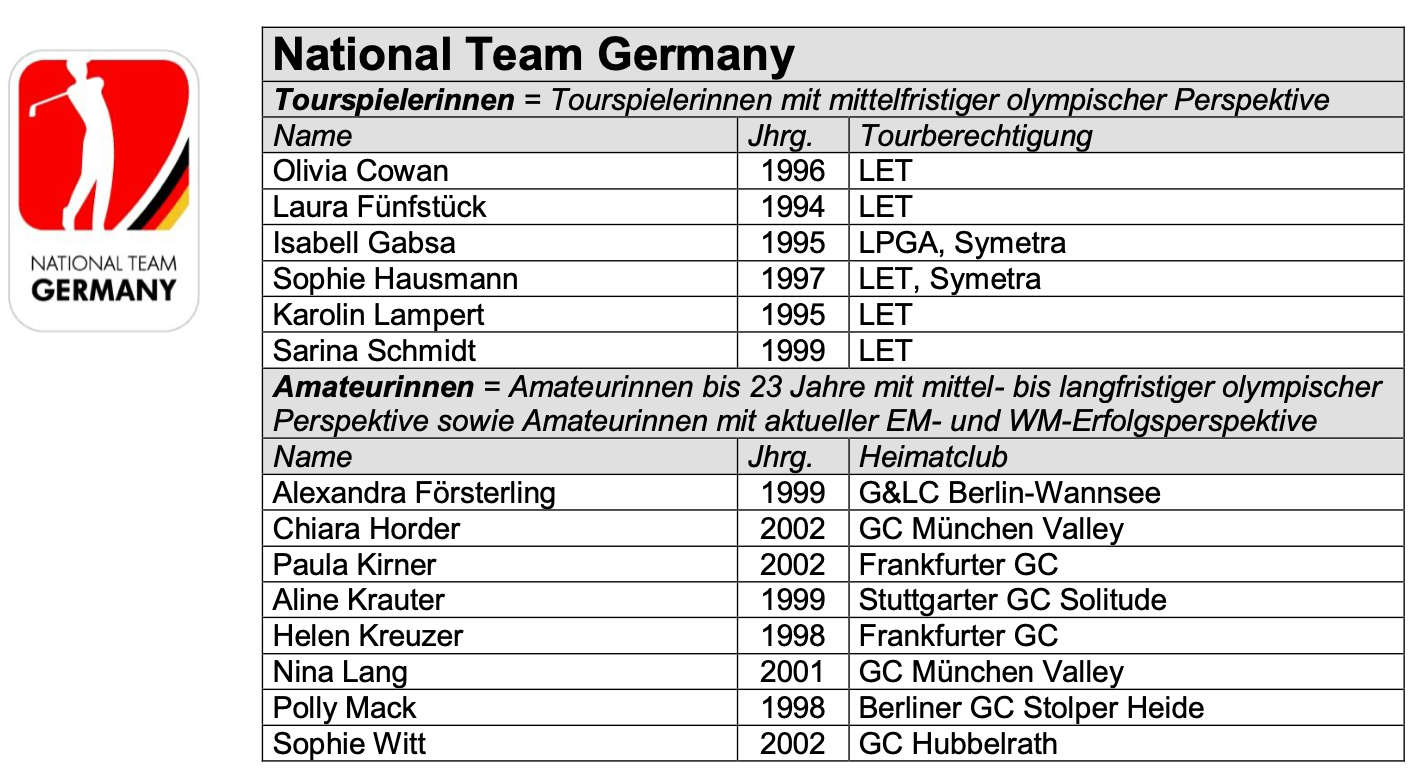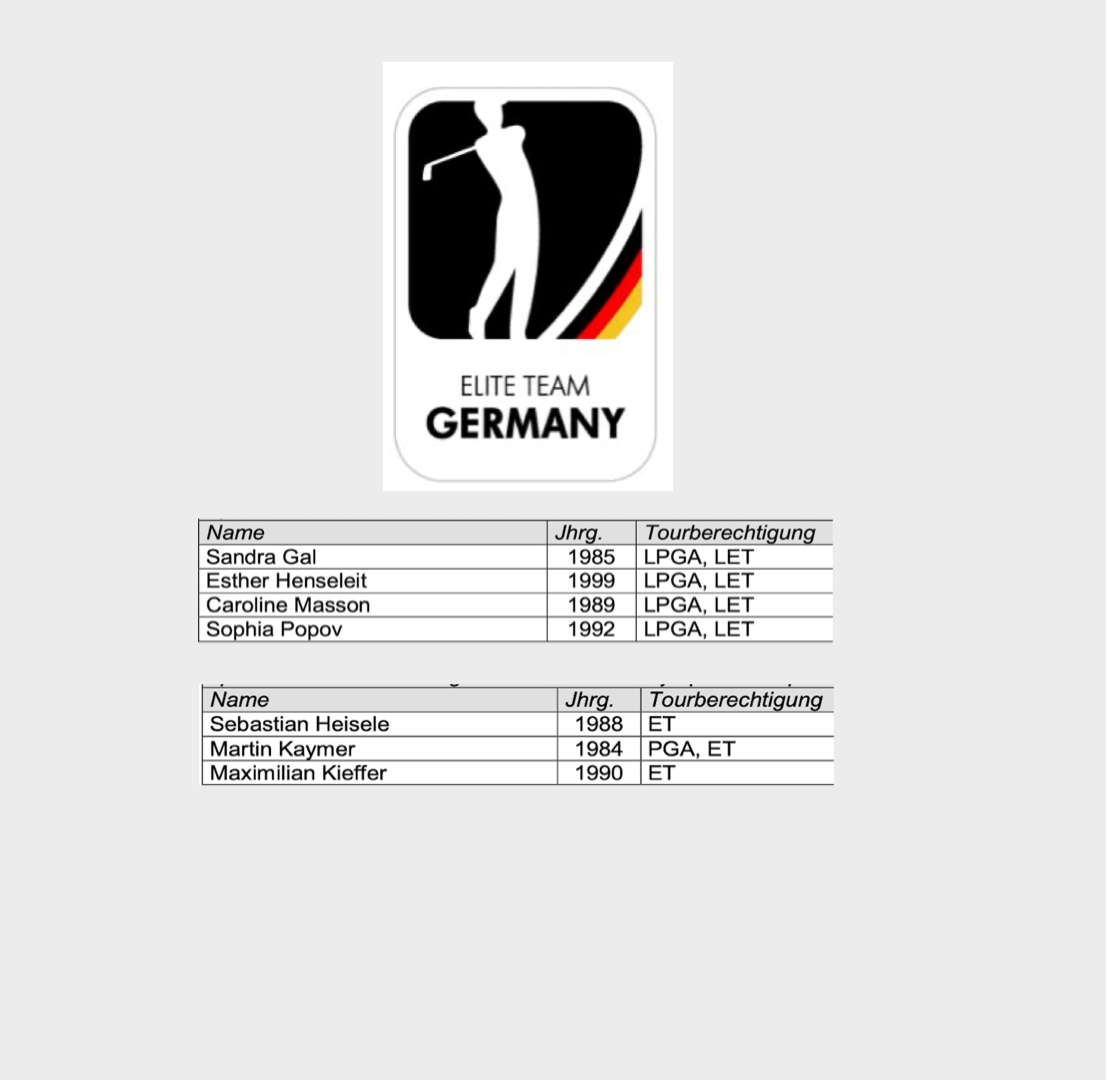Während es im Tour-Bereich nur eine Veränderung im Damenkader gibt (Popov rückt ins Elite Team auf), gibt es im Amateurbereich vier Athleten, die aus dem Junior Team ins National Team wechseln. Und bei den Damen sind Chiara Horder (GC München Valley), Paula Kirner (Frankfurter GC) und Sophie Witt (GC Hubbelrath) neu im National Team, bei den Herren gehört Wolfgang Glawe vom GC Mannheim-Viernheim nun dem Kader von Herren-Bundestrainer Ulli Eckhardt an.