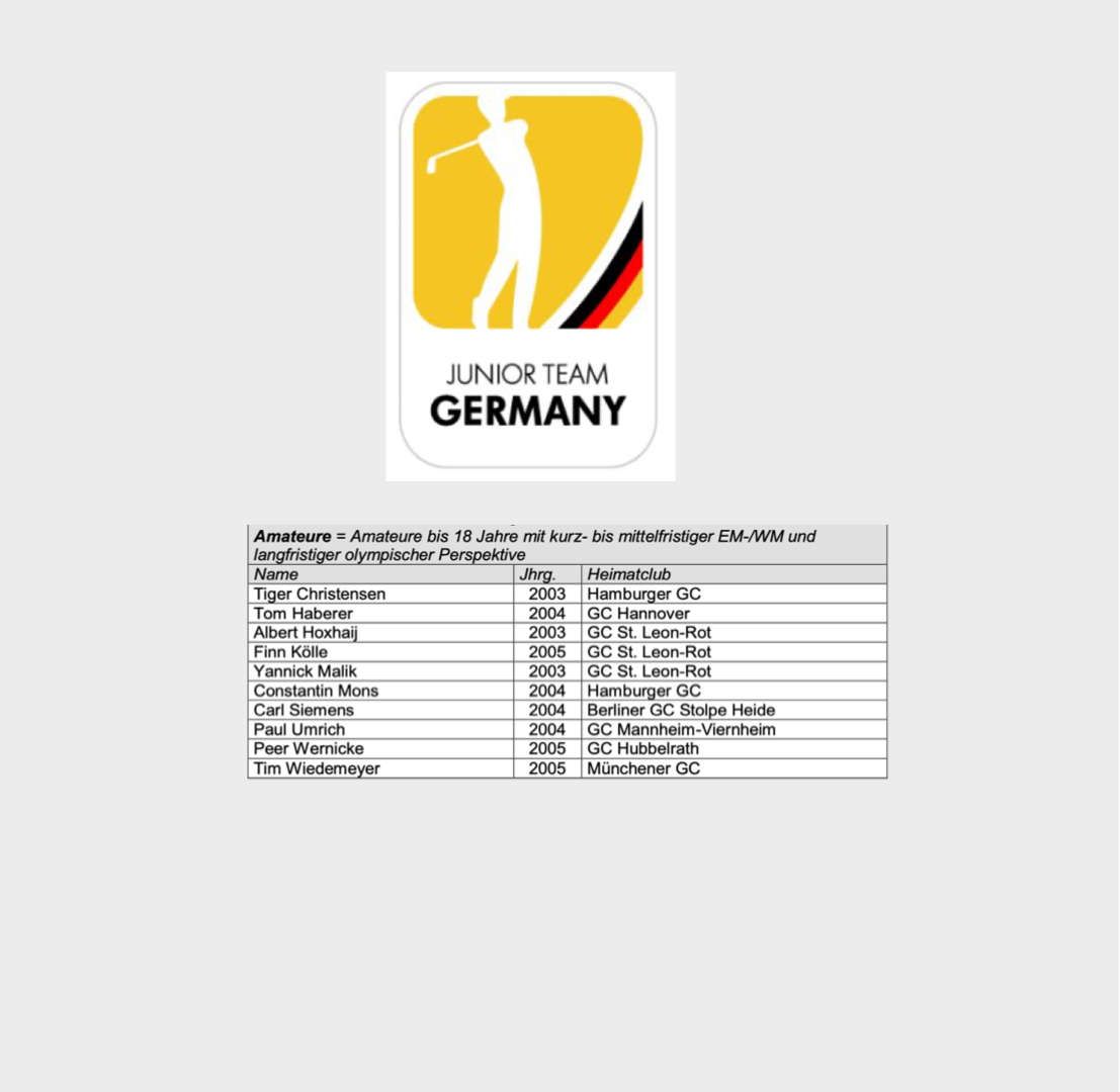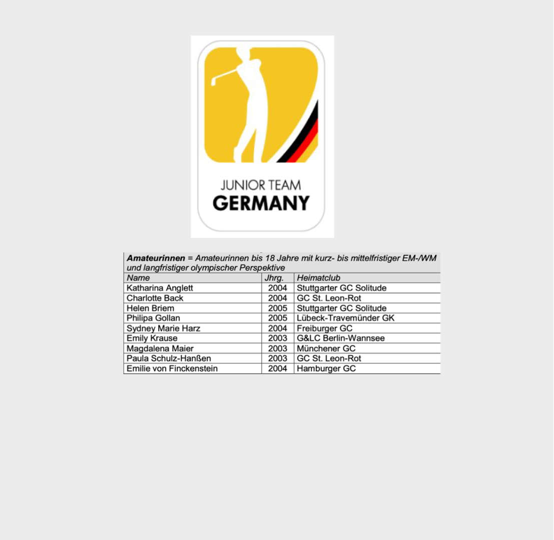 Gleich sechs neue Gesichter werden ab diesem Jahr für das Junior Team Germany antreten. Albert Hoxhaij und Finn Kölle vom GC St. Leon-Rot, Peer Wernicke vom GC Hubbelrath und Tim Wiedemeyer vom Münchener GC vervollständigen das Jungenteam. Katharina Anglett vom Stuttgarter GC Solitude und Charlotte Back vom GC St. Leon-Rot verstärken das Mädchenteam, zu dem nach wie vor die Damen-Europameisterin Paula Schulz-Hanßen vom GC St. Leon-Rot gehört.