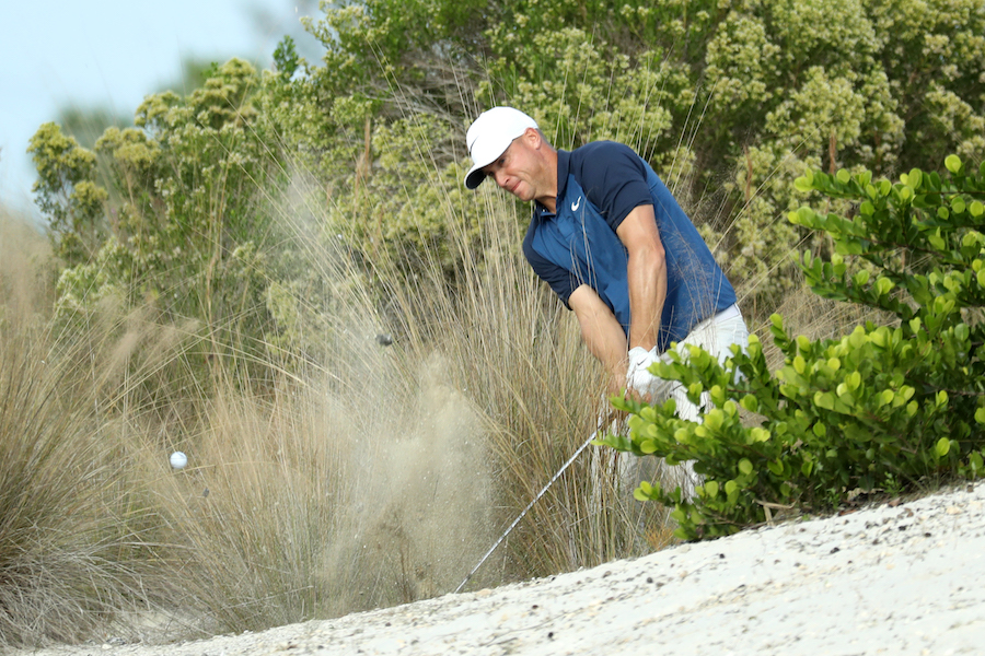Das Spiel – oder sollten wir es lieber masochistisches Massaker nennen? – heißt »Worst Ball«. Auf 18 Löchern muss er jeden Schlag zwei Mal ausführen – und immer von der schlechtesten Position weiterspielen. Der Abschlag an der engen Bahn liegt Mitte Fairway? Tja, wenn der zweite in die Bäume segelt, geht es aus dem schattigen Unterholz weiter. Auch für Annäherungen, Bunkerschläge und sogar auf dem Grün gilt die Schlechteste-Ball-Regel: Ein Zwei-Meter-Putt fällt gerade so ins Loch? Tja, dann versuchen Sie es halt noch einmal, und wenn der nicht fällt, dann zählt der schlechtere Score.