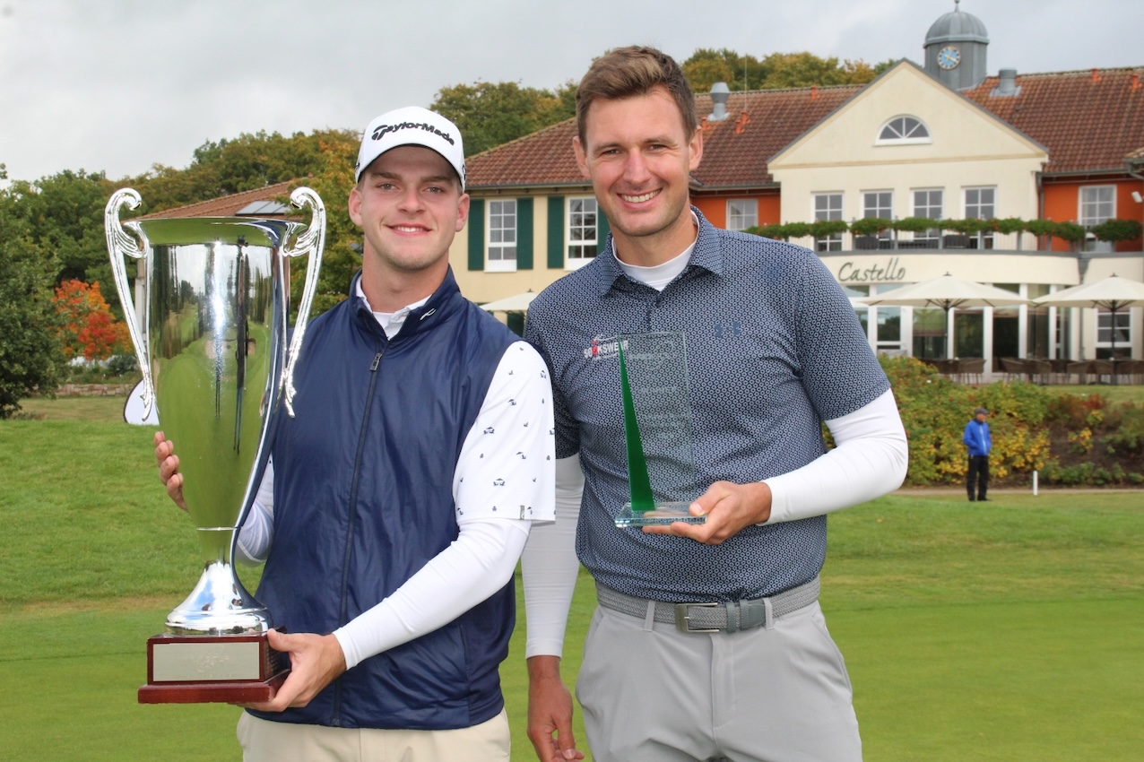 Christian Bräunig (r.) gewinnt mit der Castanea Resort Championship das Saisonfinale 2025 der Pro Golf Tour und sichert sich somit auch eine Top-5-Platzierung der Order of Merit. Somit schlägt der Deutsche kommende Saison auf der HotelPlanner Tour ab. Lars van der Vight (l.) gewann die Order of Merit. (Foto: PGT)