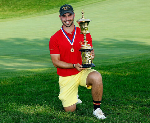 CHASKA, MINNESOTA - AUGUST 18: Jose Luis Ballester of Spain poses with the trophy after the 36-Hole Championship Match of the U.S. Amateur Championship at Hazeltine National Golf Club on August 18, 2024 in Chaska, Minnesota. (Photo by David Berding/Getty Images)