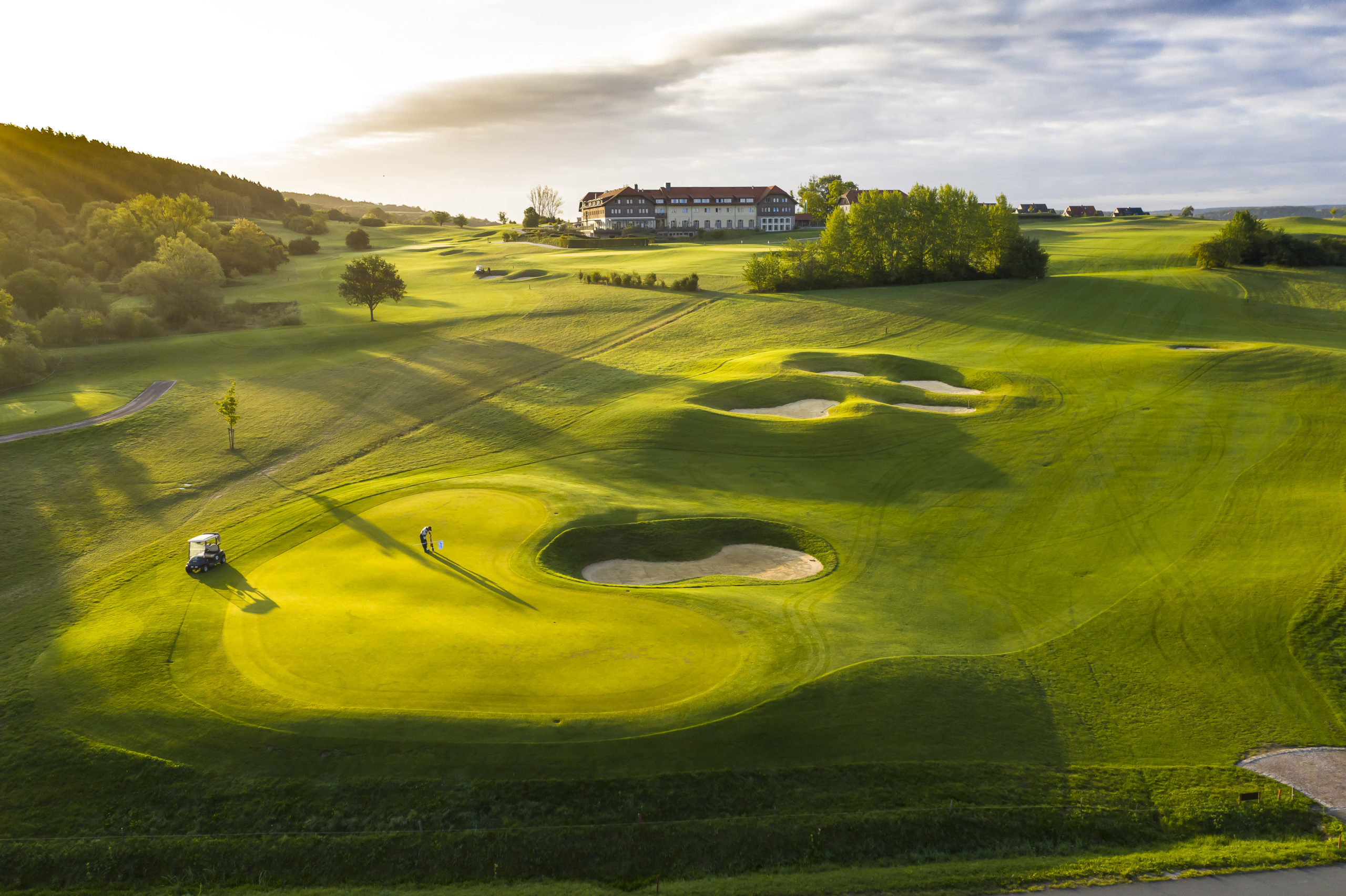 Herzstück sind die 2010 und 2012 eröffneten 18-Löcher-Plätze, Goethe-Course und Feininger-Course. Der eher flache und auf den ersten neun Bahnen wasserreiche Feininger-Course zieht sich auf der zweiten Halbrunde durch Obstplantagen – gerade jetzt im Herbst ein prachtvoller Anblick, an dem der Maler Lyonel Feininger seine Freude gehabt hätte. Der vor einer Kulisse aus altem Baumbestand angelegte Goethe-Course verläuft bisweilen durch recht hügeliges Terrain, in dem reichlich Bunker den sportlichen Reiz erhöhen. Der Clou dabei: Die beiden Plätze können kombiniert und mit 6.260 Metern von Gelb noch ein Stück fordernder werden.