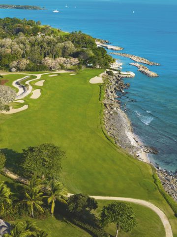 Es mag auch an der Entstehung von Multi-Millionen-Projekten wie dem Punta Espada Golf Club am wunderbaren Cap Cana gelegen haben, dass man sich in Casa de Campo veranlasst sah, mit dem Bau eines modernen Spitzengolfplatzes weiter aufzurüsten. Die Konkurrenz auf der Insel ist stark. Kein geringerer als „Golden Bear“ Jack Nicklaus entwarf 2006 mit dem Punta Espada einen 18-Löcher-Kurs, der schon jetzt bei vielen Experten und Besuchern als der beste Golfplatz in diesem Teil der Welt gilt. Die 18-Löcher-Runde als überwältigend zu bezeichnen, wäre noch untertrieben. Punta Espada ist das karibische Golfer-paradies schlechthin! Acht Bahnen verlaufen direkt an und über die tosende Küste. Dort klatscht die meterhohe Brandung gegen die Korallenfelsen und die Gischt erfrischt das strahlende Golfergesicht. Das Wasser in Cap Cana ist so karibisch-klischeehaft türkis und klar, das Grün des Salzwasser vertragenden Paspalum-Grases so leuchtend und der Sand so strahlend weiß, dass man sich in ein mit Photoshop bearbeitetes Postkartenmotiv versetzt fühlt.