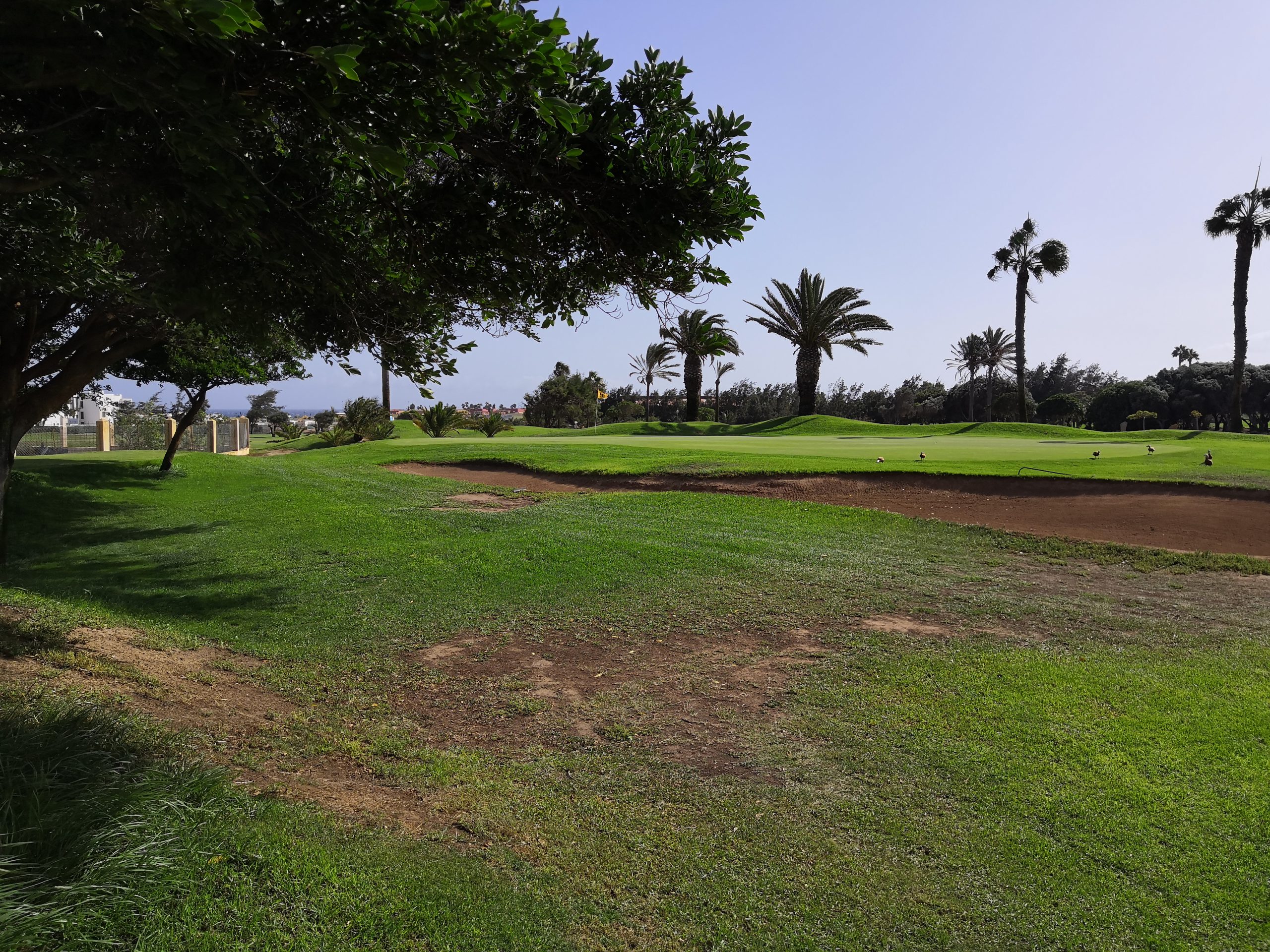Der 2002 eröffnete Parcours ist nicht nur der älteste 18-Löcher-Platz auf »Fuerte«, sondern mit 150 Hektar auch die größte Grünfläche der wüstenartigen Vulkaninsel überhaupt. (Wobei das mit dem Grün bei unserem Besuch so eine Sache war: Direkt nach dem heißen Sommer zeigten sich Fairways und Abschläge doch etwas lädiert, sie sollen im Winter aber wieder top in Schuss sein.) Für eine abwechslungsreiche, sportlich anspruchsvolle Runde in dem leicht hügeligen Gelände sorgen fast 70 Bunker, drei Teiche und der sie verbindende Bach, wodurch immer wieder Wasser ins Spiel kommt.