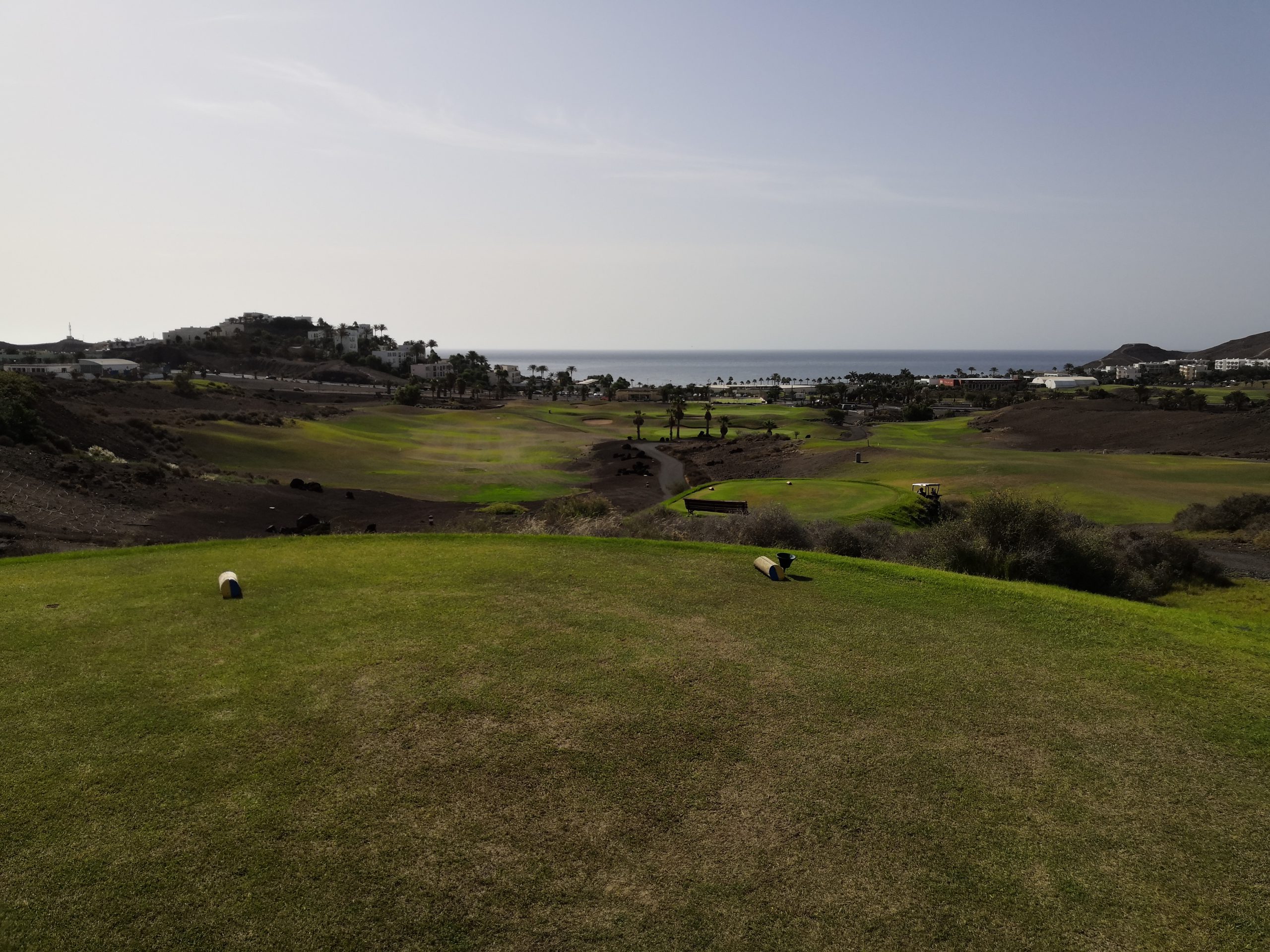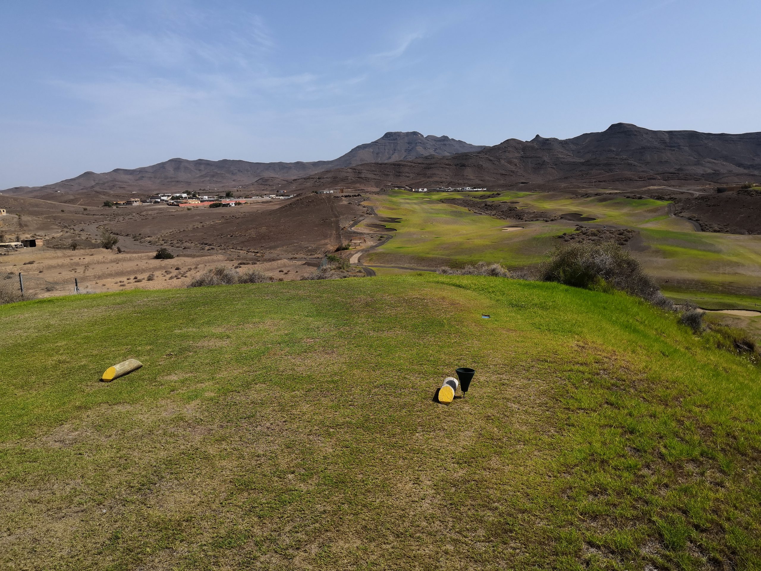 Die Fairways präsentieren sich meist weitläufig, die Putt-Flächen großzügig, spurtreu und teils interessant onduliert. Die Par-5-Löcher sind allesamt recht kurz, die One-Shotter dagegen ziemlich stramm. Im Gedächtnis haften bleiben am Ende die Ausblicke aufs Meer und etwa ein Drittel der Spielbahnen des Fuerteventura GC, allen voran das finale Duo: Die 17, ein von Gelb nur 440 Meter langes Par 5, führt steil bergauf bis zum höchsten Punkt der Anlage – und die 18 stürzt sich dann als kräftig bebunkertes Dogleg wieder tief hinunter.