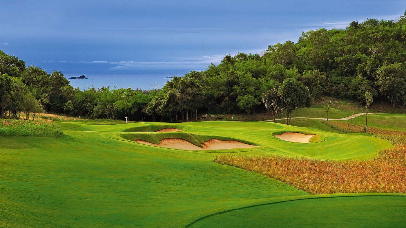 Nur wenige Monate nach der Eröffnung gab’s für das Werk des einheimischen Platzarchitekten Pirapon Namatra (Golf East) gleich die erste Auszeichnung: »Best New Course in Asia Pacific 2009«. Und diese sowie die vielen später noch folgenden sind wirklich verdient: Der Parcours ist optisch und sportlich ein Genuss. Die ziemlich hügelige, wunderschön anzusehende Landschaft ist von vielen unterschiedlichen, farbenfrohen Bäumen bewachsen. Kleine Ananasfelder sind Überreste der früher hier betriebenen Plantage, alles wirkt sehr natürlich. Die großzügig breiten Spielbahnen sind oft recht kurz, für die nötige Herausforderung sorgen dafür aber durchdacht platzierte Bunker, Waste-Areas und Wasserhindernisse. Insbesondere am Tee sollte man sich deshalb Gedanken über Taktik und Schlägerwahl machen. Und dann wären da noch die Grüns. Mal erhöht, mal durch sehr tiefe Sandgruben bestens verteidigt, mal riesig groß (z.B. an Loch 17). Spektakulär ist das Signature-Hole. Auf Bahn 15, einem eher kurzen Par 3, erschwert vor allem der prächtige Panoramablick über das Meer bis zur Insel Singto im Golf von Thailand die Konzentration auf den Schlag.