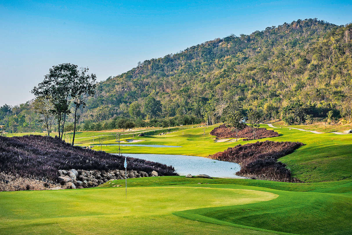 Die von Roger Packard entworfene Kombi der zwei Neunerschleifen Mountain (A) und Lake (B) ist die attraktivere in dem 36-Löcher-Resort, in dem auch zehn Jahre nach unserem ersten Besuch immer noch ohne Course-Rating- oder SSS-Werte gespielt wird. Aber gut, bei den Pros, die hier alljährlich die Qualifying-School für die Asian Tour bestreiten, zählt ja nur das Brutto. Der A-Kurs präsentiert sich mit welligen, aber fehlertoleranten Fairways und ondulierten Grüns, die schöne Kulisse mit vielen Bäumen, reichlich Hügeln und den Bergketten im Westen der Region Hua Hin/Cha-am verrät, woher der Platzname kommt. Ab Loch 10 ändert sich das Bild dann gravierend. Denn der Lake-Course zeigt sich als glitzernde, mit Palmen und Schilf garnierte Seenlandschaft, in der auf fast jeder Bahn Wasser ins Spiel kommt. Fehler werden entsprechend schnell bestraft. Das absolute Highlight ist Loch 14 (B5, dessen Grün übrigens nur ein Par 5 vom benachbarten Springfield Royal CC entfernt ist): Sowohl der Abschlag als auch die Putt-Fläche liegen auf einer eigenen Insel!