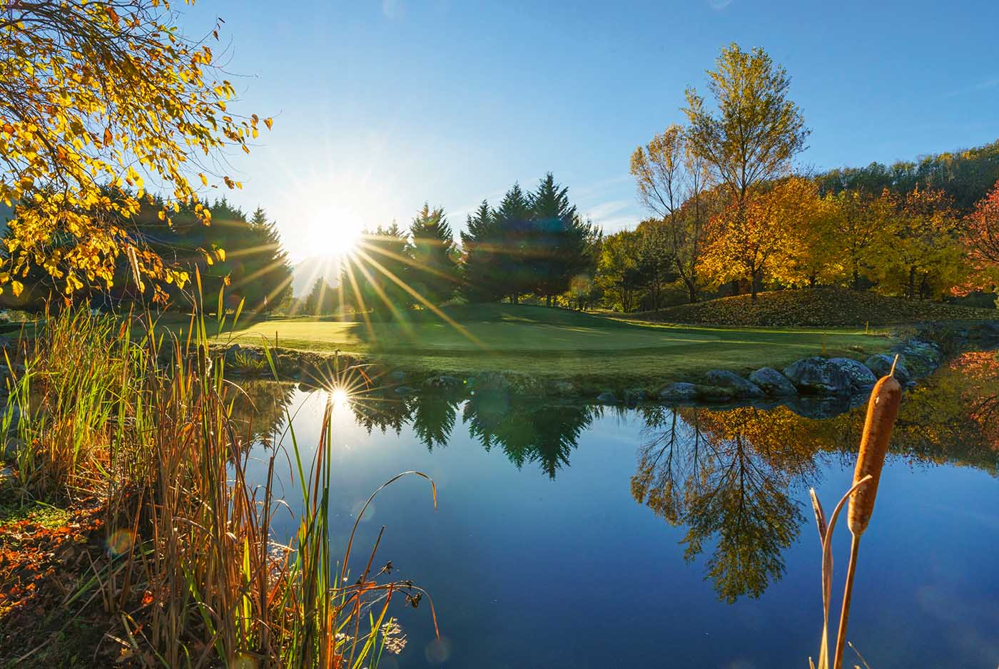 Die im September 2001 eröffnete Anlage war von 2006 bis 2012 Austragungsort der Deutsche Bank Ladies’ Swiss Open – und das hat gute Gründe. Zum einen wäre da das moderne Design, das eine gute Mischung aus Präzision, Länge und gutem Course Management verlangt. Zum anderen die überaus anspruchsvollen, großen, ondulierten und schnellen Grüns, die schon mal dazu führen können, dass Unsicherheiten bezüglich des eigenen Putt-Vermögens aufkommen (können). Zwischen den flachen, relativ breiten Spielbahnen, die von einzelnen Bäumen und auch Baumgruppen gesäumt sind, gibt es auffällige Hügellandschaften, die vom rechten Weg abgekommene Bälle teilweise wieder in Richtung Fairway hüpfen lassen. Geschieht dies nicht, sind Hanglagen die Folge, die nicht immer einfach zu meistern sind. Der Par-5, Par-3, Par-5, Par-3 Anfang ist ungewöhnlich, bringt einen aber in Schwung, bevor es dann von Loch 5 bis 11 »nass« wird. Jedes der Löcher hat entweder einen See oder einen Bach, der auf ungenaue Schläge dauert und ein Risiko für den Score werden kann. Die Knaller-Löcher sind die 5, ein kürzeres Par 4, bei dem der Schlag in das lange, schmale Grün über Wasser erfolgen muss, das sich zudem links vom Grün bis zu dessen Ende schlängelt, und die 18. Dieses längere Par 4 endet direkt vor der Clubhausterrasse, wo man gerne bei einem Apero sitzt und beobachtet, wie sich die nach einem spielenden Spieler beim Schlag zum mit Wasser und Sand verteidigten Grün anstellen.