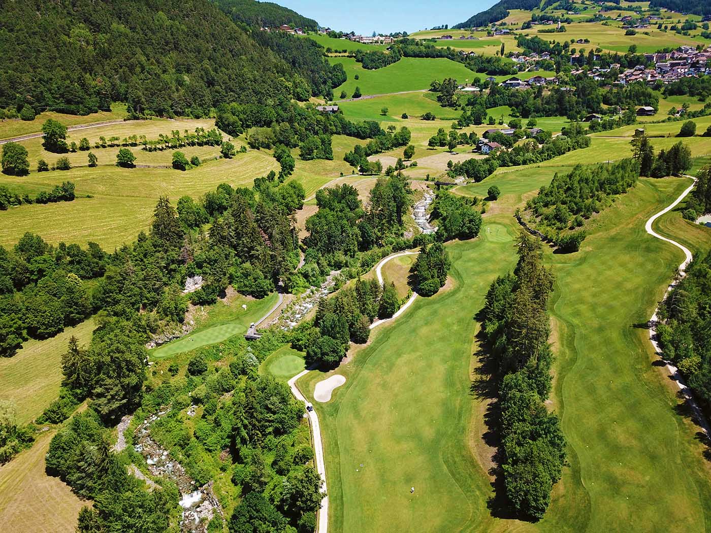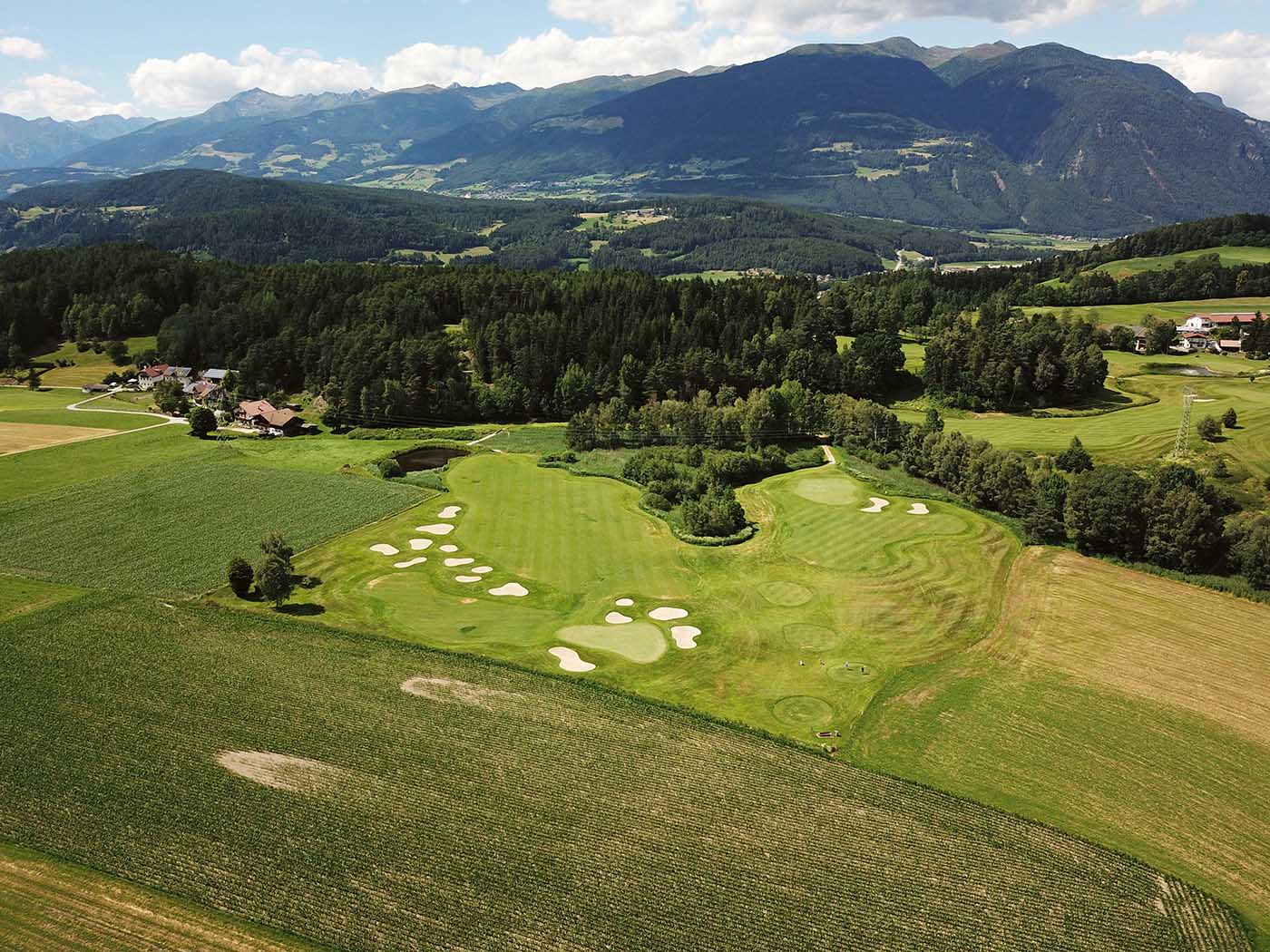 Bei Bruneck liegt der Golf Club Pustertal (Tel: +39 0474 412 192), der sich elegant in die Landschaft einfügt. Es geht recht ungewöhnlich mit einem Par 3 los, doch Pustertal ist alles andere als ein Kurzplatz, schon die 2, ein Par 4, kann auf 430 Meter Länge gesteckt werden und misst auch von Gelb noch 401 Meter. Die interessanteste (und schwierigste) Bahn ist die 5, ein Par fünf mit scharfem Dogleg und Wasser rechts am Grün. Selbst Longhitter dürften es sich zwei Mal überlegen, hier allzu aggressiv zu werden.