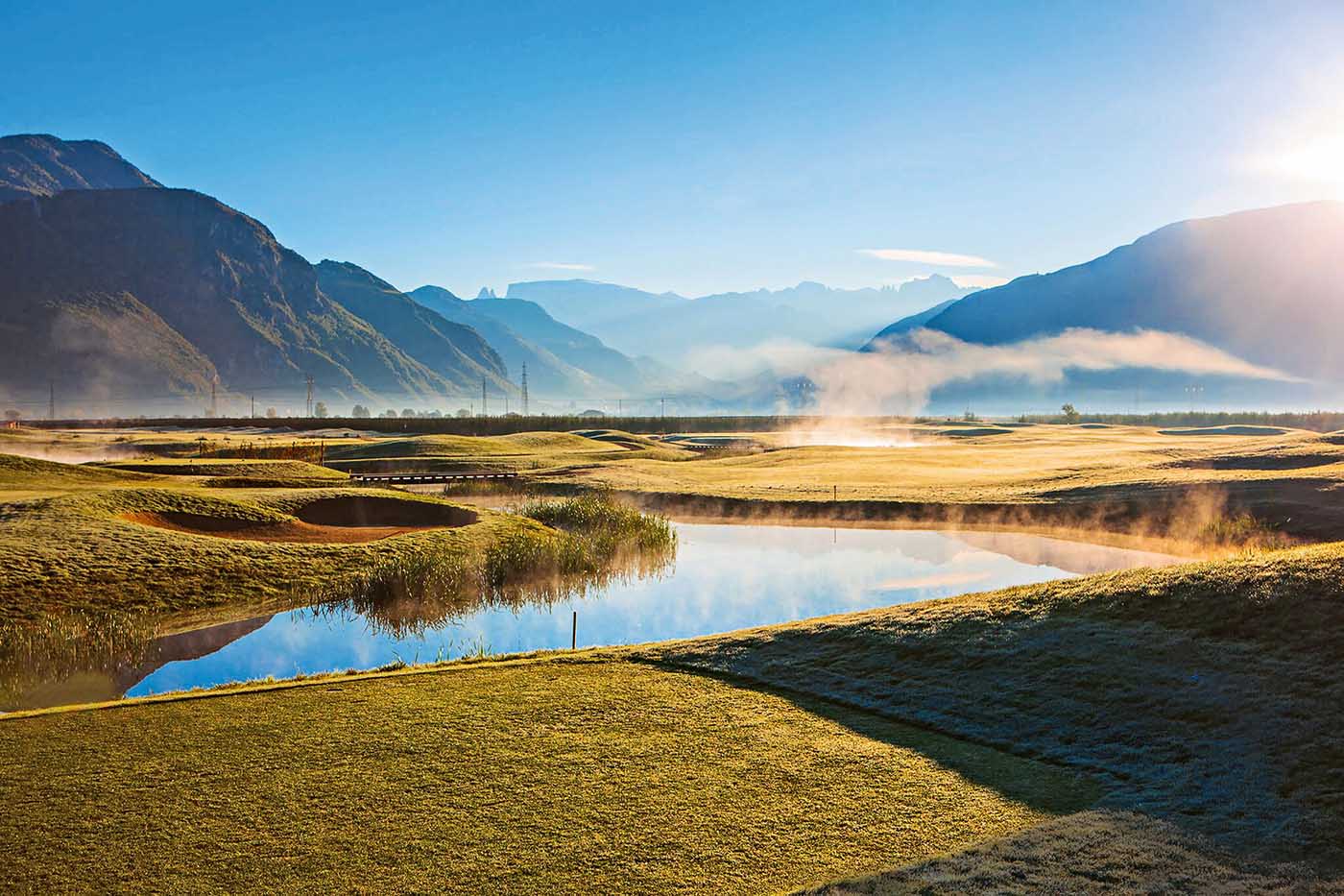 Jetzt zum Golfen: Wer glaubt, dass Südtirol nur ein paar alpine Kletter- und Kurzplätze bietet, der wird sich wundern – die Auswahl ist enorm und vielfältig. Da wäre beispielsweise der neueste Platz in Südtirol, der Golf Club Eppan (Tel: +39 0471 1888164), der von Thomas Himmel entworfen wurde und den Spitznamen »Blue Monster« trägt. Der 9-Löcher-Platz geizt nämlich nicht mit Wasser, ganz wie sein großes Vorbild in Doral. An der 8, einem knapp 510 Meter langen Par 5, kommt bis zum Grün bei jedem Schlag Wasser ins Spiel. Und es stimmt – in der Höhenluft fliegen die Bälle weiter. Aber eben leider nicht genauer. Es ist ein Platz, der mit seinem Layout und den großen Grüns eher untypisch für die Gegend ist und damit beweist, wie abwechslungsreich ein Golfurlaub in Südtirol sein kann.