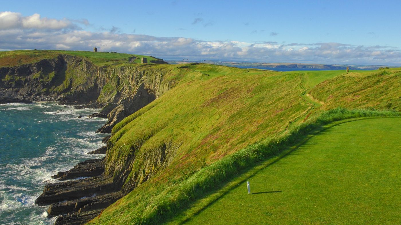 Wie die Halbinsel zu ihrem Namen kam, ist historisch nicht belegt, am wahrscheinlichsten ist die Version, dass die Form des Landstreifens zum Namen "Old Head" führte. Aber ob Kopf, geschwollener Daumen, Herz oder Diamant – unbestritten ist, dass der 90 Hektar umfasssende Landstrich auch ohne Golfplatz ein spektakuläres Gelände wäre. "Old Head" ist eigentlich eine Dreiviertelinsel, die wie ein gewaltiger Tafelberg im Meer liegt. Das Felsplateau am südwestlichen Zipfel von Irland, das bis zu 100 Meter hoch aus der Keltischen See herausragt, ist nur durch einen schmalen Streifen Land mit dem Festland verbunden, an drei Seiten krachen die Wellen an steil abfallende Klippen.
