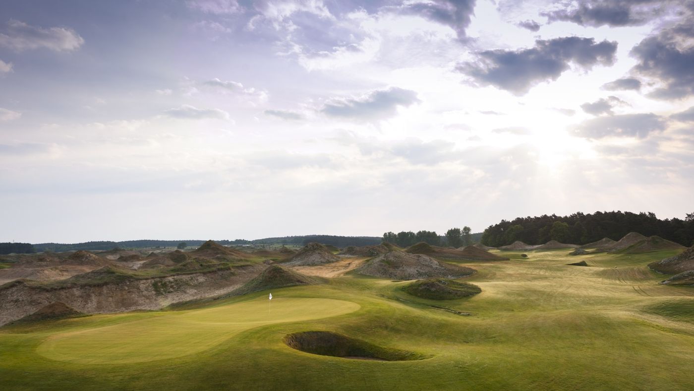 Golfarchitekt David J. Krause hat hier in Mecklenburg, inmitten von karger Bepflanzung mit Ginster und Heidekraut, sein Meisterstück hingelegt – und damit die Spitze der nationalen GJ-Platzrangliste erobert. Natürlich hat dazu auch maßgeblich die hügelige Endmoränenlandschaft beigetragen, insbesondere auf den ersten Neun, deren Löcher vor einer herrlichen Kulisse sehr individuell auf unterschiedlich hohe und hügelige Höhenlagen verteilt werden konnten.