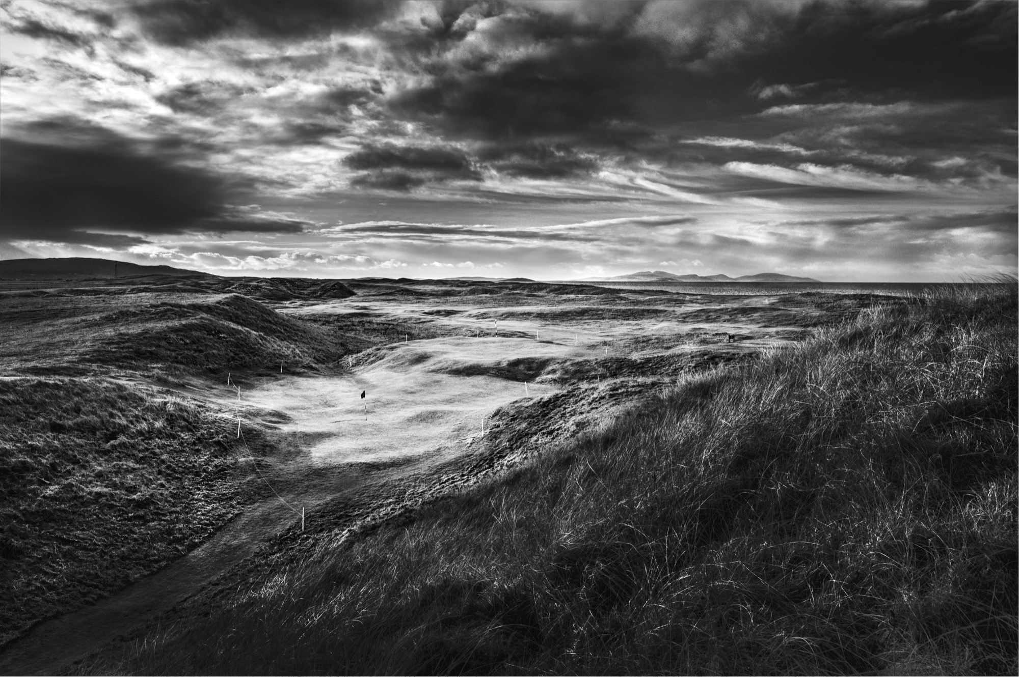 Unsere nächste Fähre von Leverburgh nach Berneray ist oberpünktlich. Wir erwischen noch den überfüllten Linienbus, der mich in zwei Stunden durch North und anschließend ganz South Uist fährt. Inseln, die nur durch einen schmalen Damm miteinander verbunden sind. Unser Ziel ist das Borrodale Hotel in Daliburgh nahe dem Askernish Golf Club. Vor 120 Jahren baute Old Tom Morris den Platz von Askernish. Er ist rauer, härter, natürlicher, majestätischer und magischer als die meisten seiner Links-Kollegen auf dem Festland. Vergleichbar mit einem Rind aus den Highlands, dem die Haare weit über die Augen gewachsen sind – echt schottisch, seit Generationen unverwüstlich gut. „Es ist wichtig, dass man wenigstens ein Mal hier gespielt hat“, erzählt mir Clubpräsident Ralph Thompson, „um mit eigenen Augen zu sehen, was mit Worten schwer zu beschreiben ist.“ An manchen stürmischen Nachmittagen beendet Thompson die Runde mit einem Freund an Loch 11. An diesem 170 Meter langen Par 3 bleiben sie bis zum Ende des Tages, lachen und machen etliche Schläge mit dem 5er-Holz, bis im Bag kein einziger Ball mehr zu finden ist.