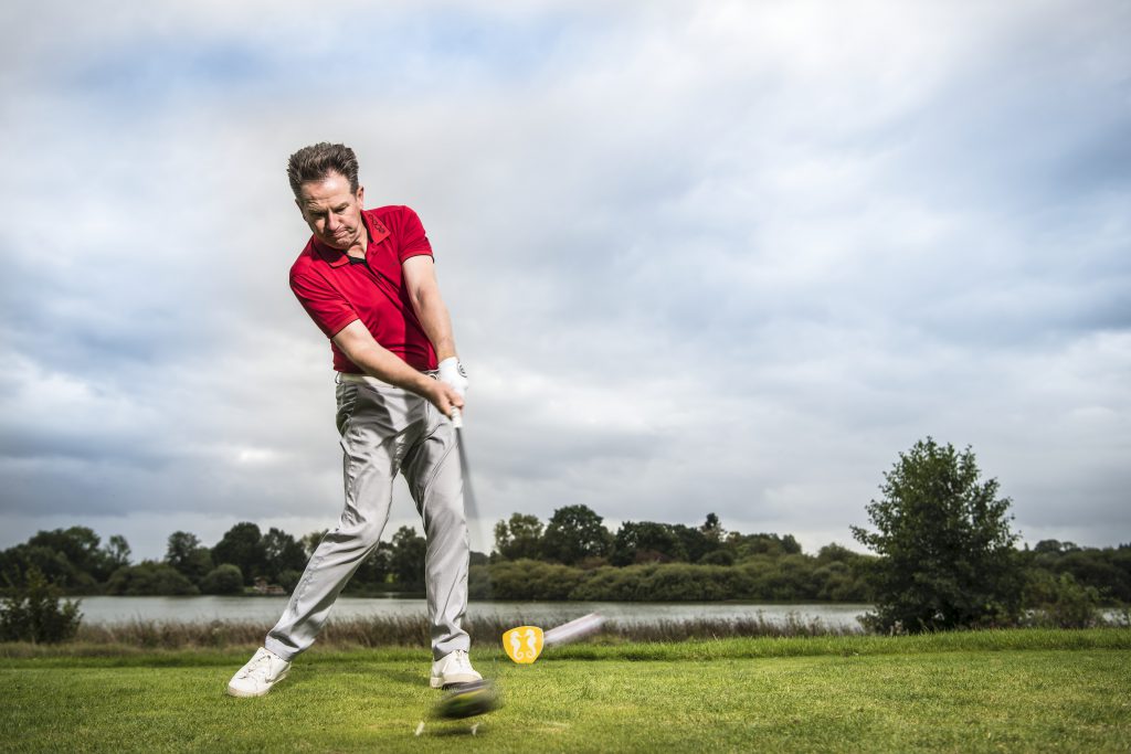 Sehen Sie sich die Bildreihe meines Schwungs oben bitte genau an. Beim Abschwung zum Ball habe ich auf dem halben Weg, im Vergleich zum Ende des Rückschwungs, ein paar Zentimeter an Höhe verloren. Das folgende Wiederaufrichten im Treffmoment ist letztendlich eine Folge der vorhergehenden Bewegung. Wenn ich mich im richtigen Moment in den Boden hineindrücke und sozusagen „aufspringe“, kann ich die Energie, die ich entwickelt habe, auf den Ball übertragen.