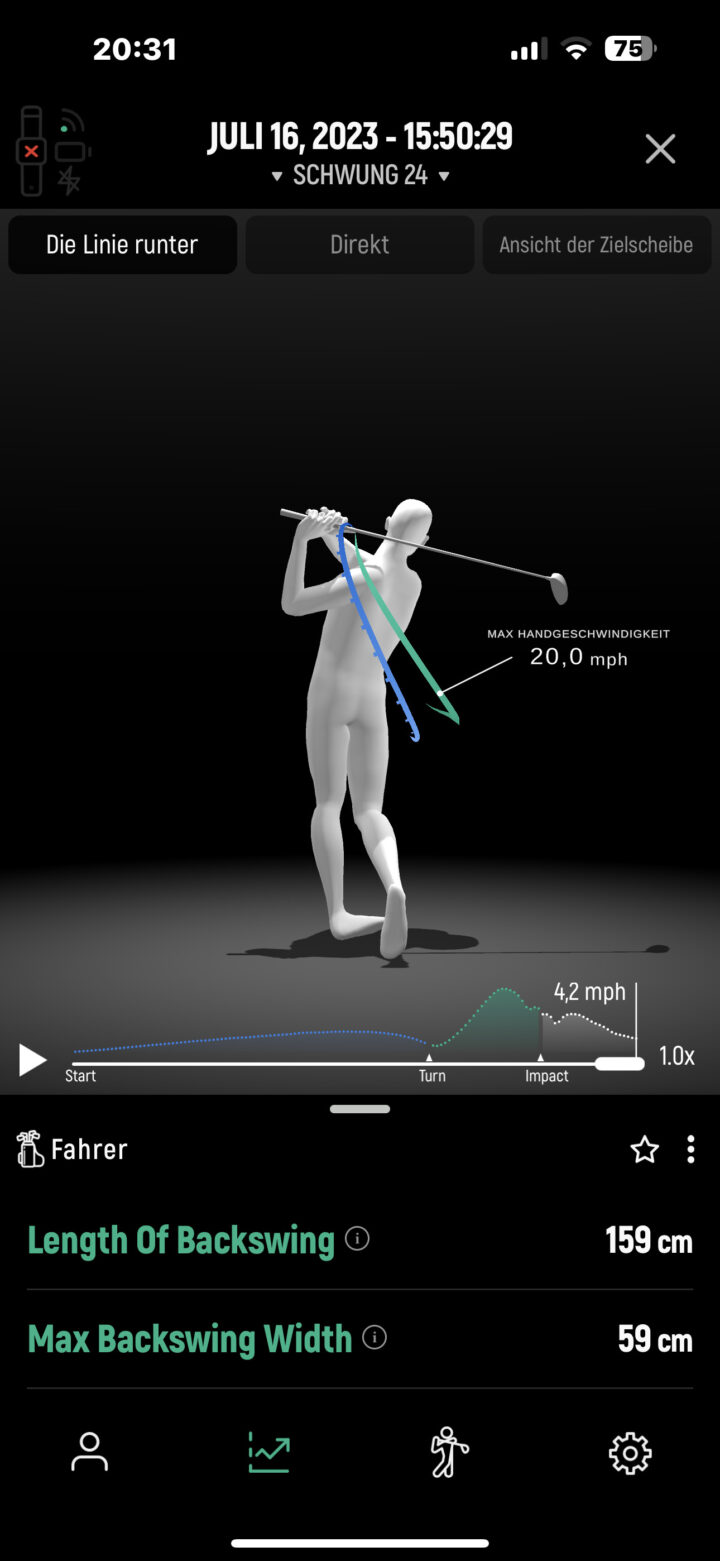 Die Software kann in Echtzeit mitteilen, ob Sie im Moment Übergangs vom Rück- zu Durchschwung mit den Händen auf Ihrer gewünschten Schwungbahn sind oder nach vorne schwingen.