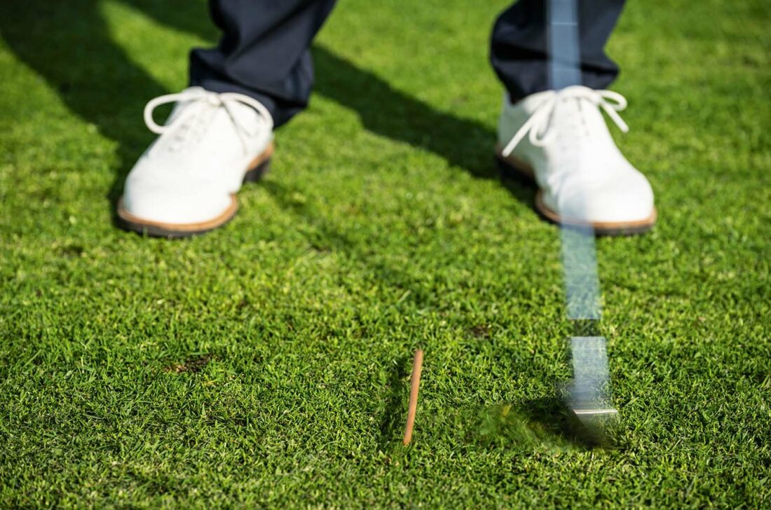 Die Impacthöhe ist eine enorm unterschätze Fähigkeit im Golf. Leider wird diese fast nie thematisiert – außer im Golf Magazin. Wenn man Bälle mit der Schlagflächenmitte treffen möchte, ist es unerlässlich, auch die Höhe der Schlägersohle über dem Boden zu kontrollieren. Eine ideale Übung dafür ist, etwas ganz Kleines vom Boden zu schlagen. Konkret in unserer Take-Away-Serie ist es sogar noch präziser, den oberen Teil eines Essstäbchens mit der Sohle zu treffen – und zwar so, dass das Stäbchen elegant über den Boden hüpft (Fotos unten). Das nennt man dann perfektionierte Millimeterkontrolle. Versuchen Sie diese Stäbchen-Übung zunächst bei einer geringeren Schwunggeschwindigkeit und steigern sich dann, bis Sie bei vollem Schwung-Speed das Stäbchen über den Boden tanzen lassen.