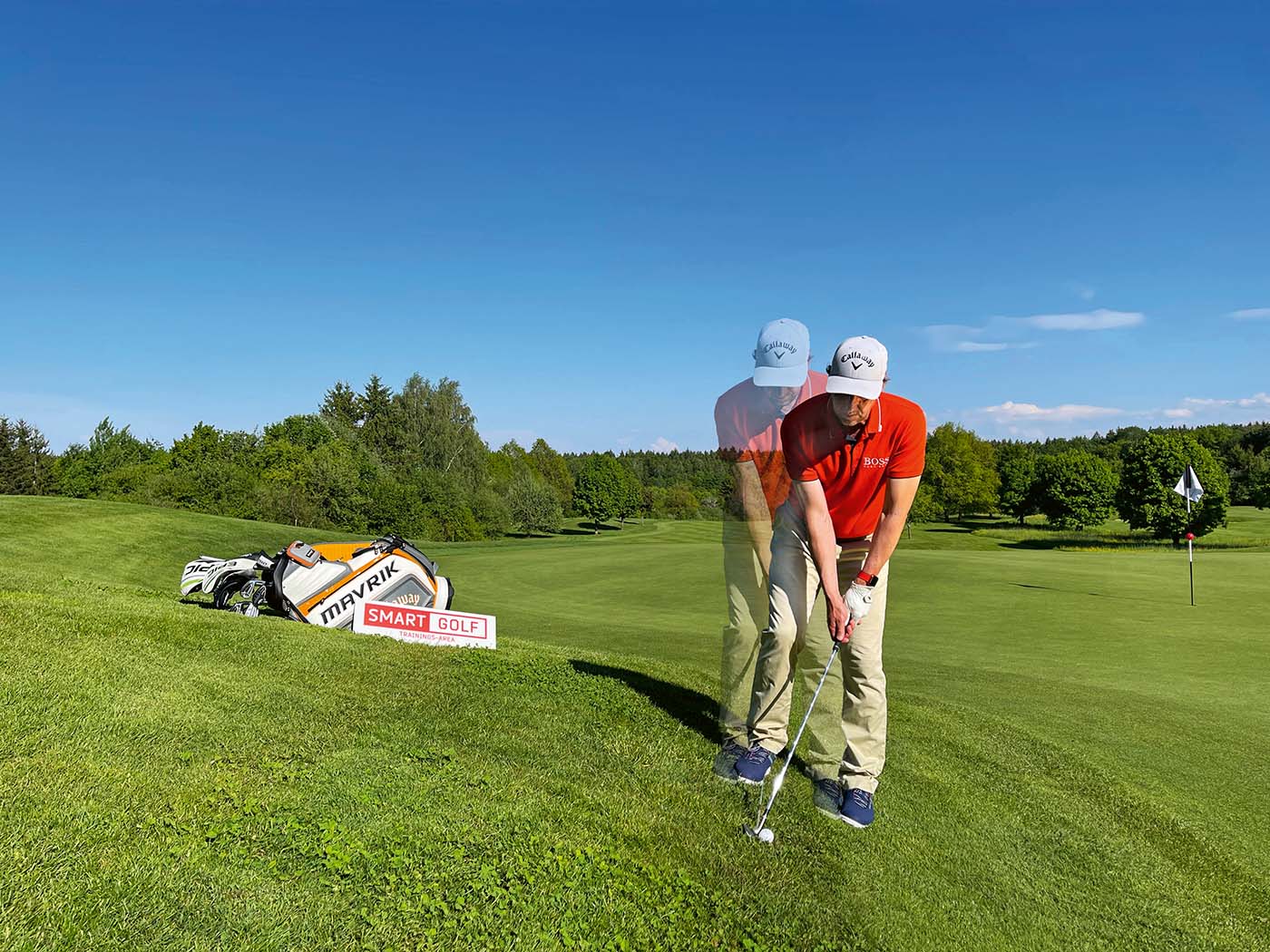 Set-up: Gegenüber einem normalen Golfschlag – siehe Geisterbild – hat Tino den Ball mehr nach rechts in seinen Stand gelegt.