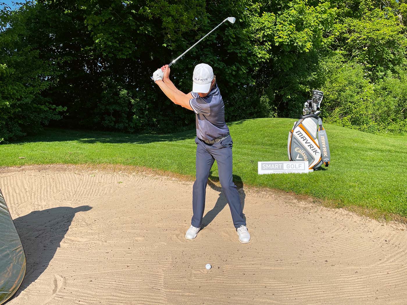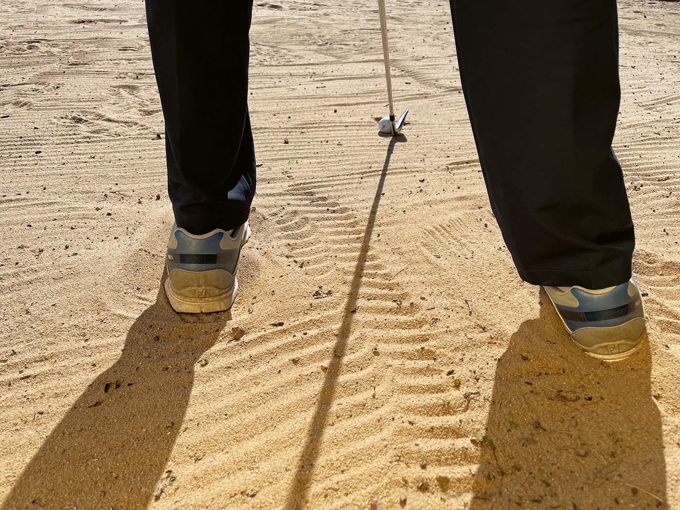 Bernhard Langers Tipp: Graben Sie Ihren rechten Fuß schräg in den Sand ein. Im Rückschwung geht dann ein größerer Widerstand von Ihrem rechten Fuß aus. Das erschwert, zu weit zurück zu schwingen und Sie spüren sofort Druck auf dem Fuß, um Ihr Gewicht nach links zu bringen.