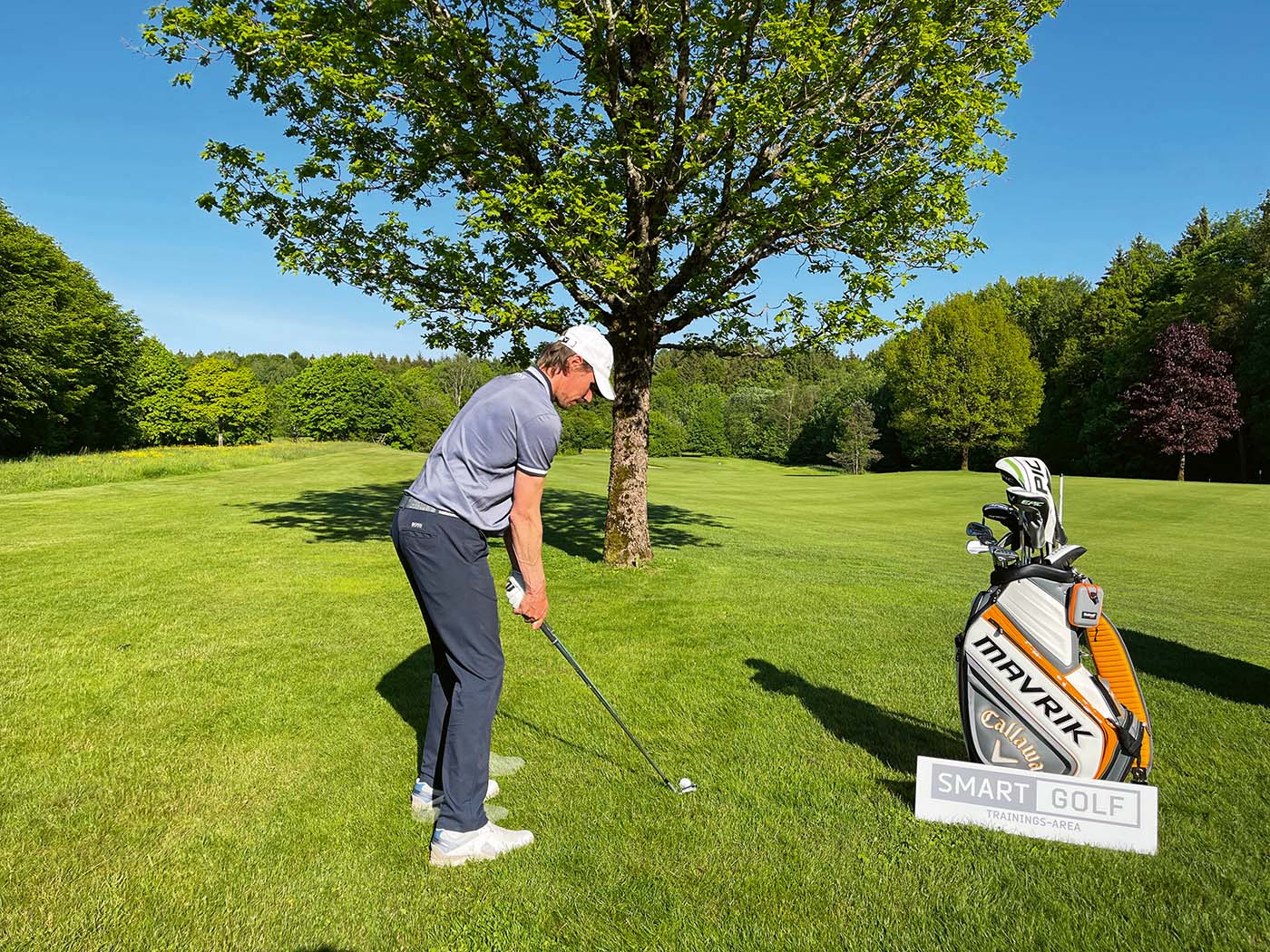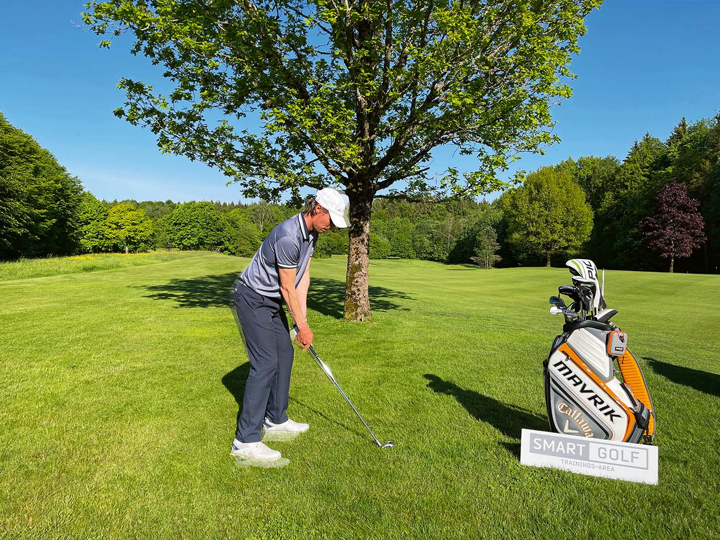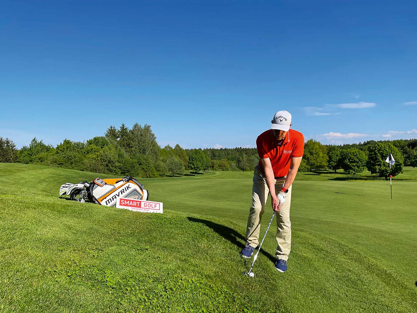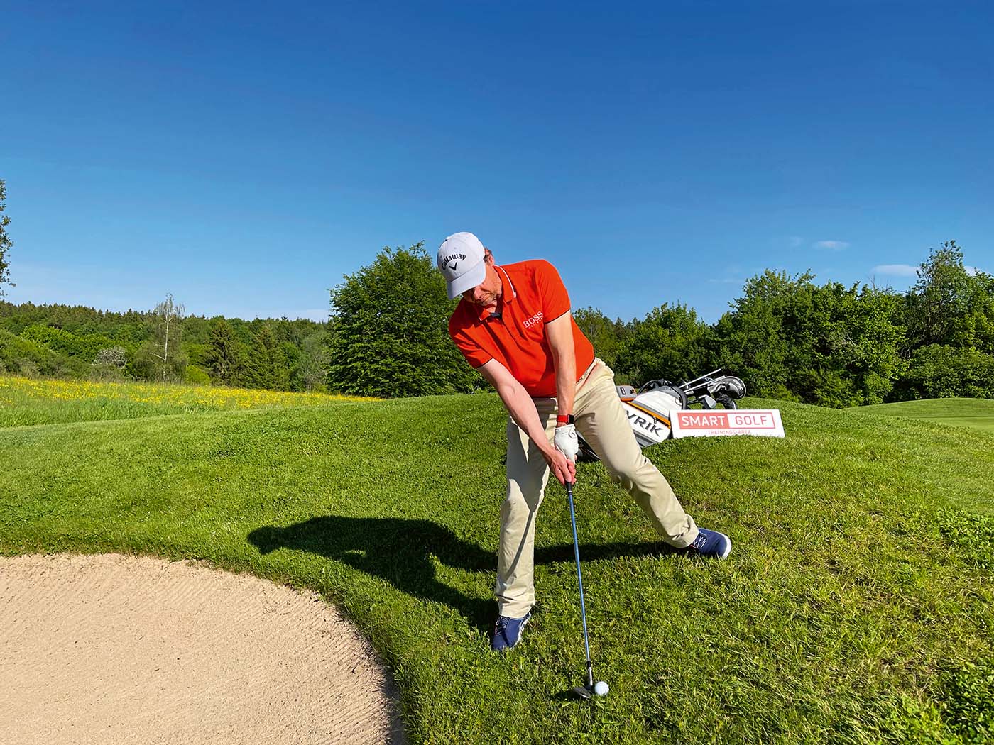 Richtig: Gleiche Lage, gleicher Stand – Anstatt eines Sand-Wege benutzt Clemens ein Eisen 8. Die Schräglage, die er im Hang einnimmt, kommen als Loft an der Schlagfläche hinzu. So wird aus einem Eisen 8 mit durchschnittlich 40 Grad Loft schnell ein Wedge mit viel Loft. Wer den Ball weiter fliegen oder rollen lassen möchte kann alternativ auch ein Eisen 6 spielen.