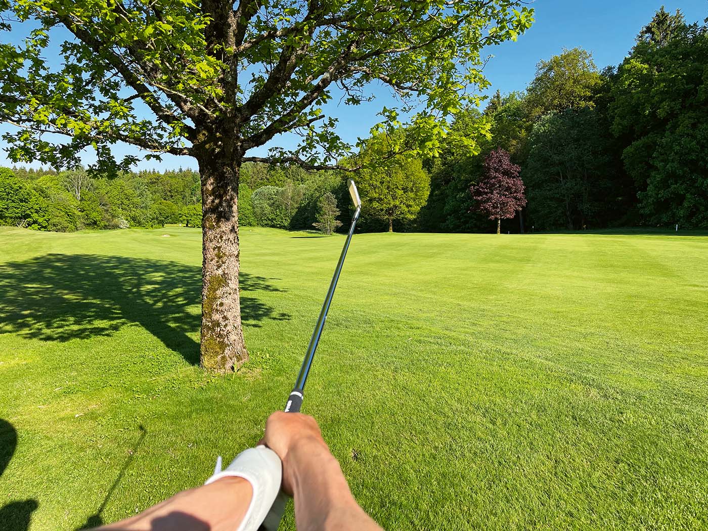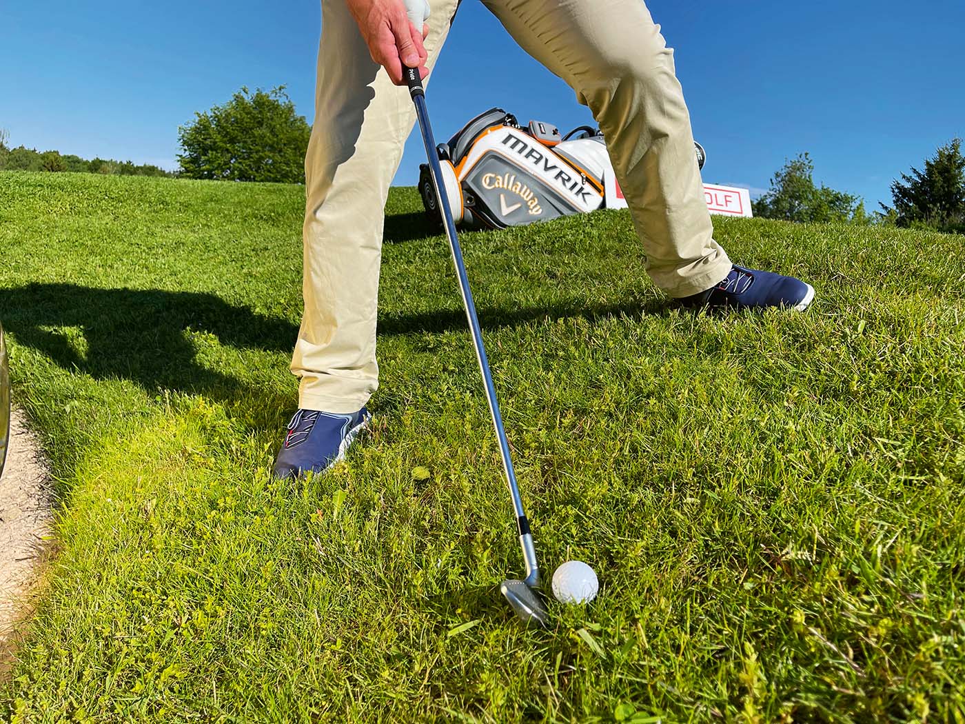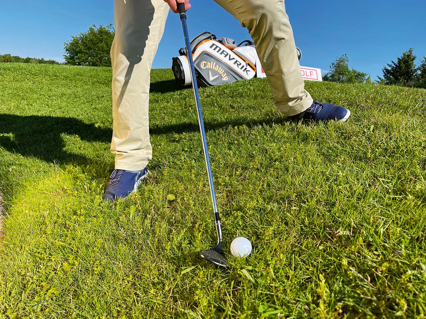 Wer gerne seinen Ball mit der Hand fangen möchte, kann bei solchen Schräglagen das Sand-Wedge aus dem Bag ziehen. Wenn die Schlagfläche Richtung Himmel blickt, ist der Weg zur Fahne noch sehr weit. Wer hingegen lieber näher Richtung Fahne spielen möchte, sollte den Ball flach halten.