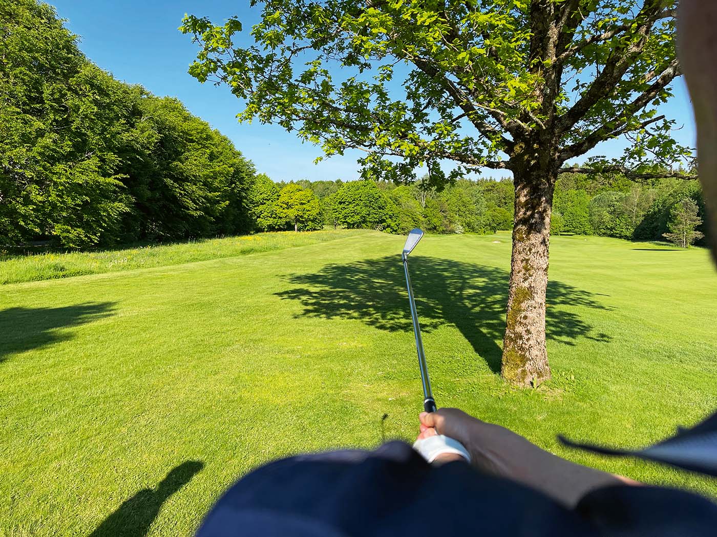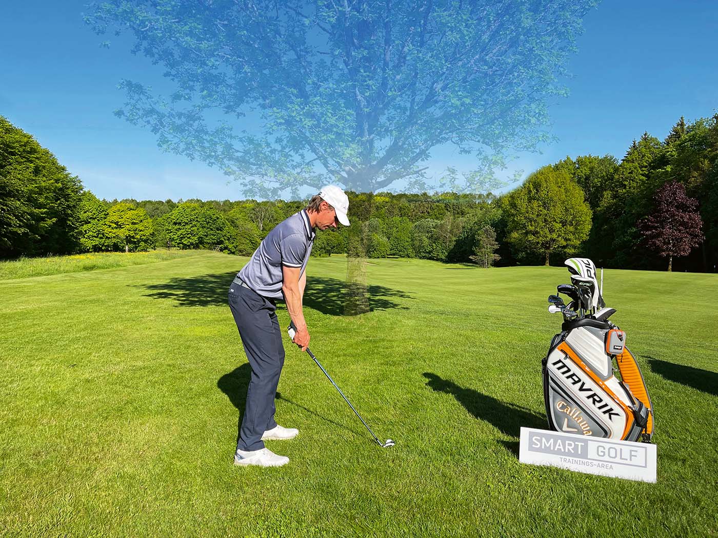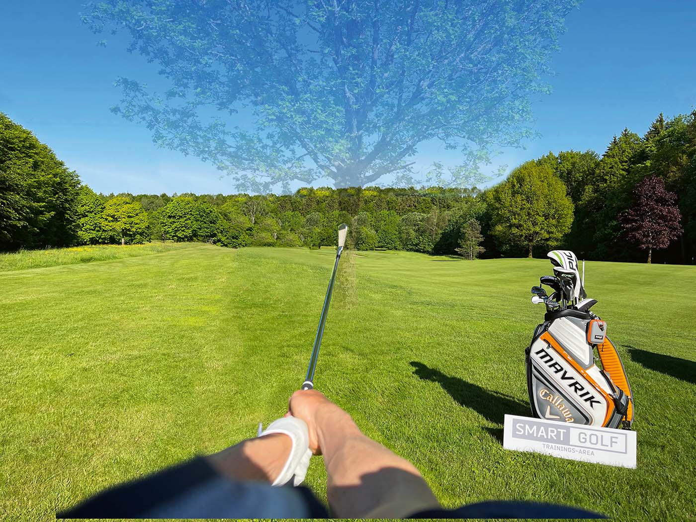 Strategie: Sie schwingen links am Baum vorbei. Durch die offene Schlagfläche bekommt der Ball einen Rechtsdrall und wird entsprechend in einer Rechtskurve fliegen.