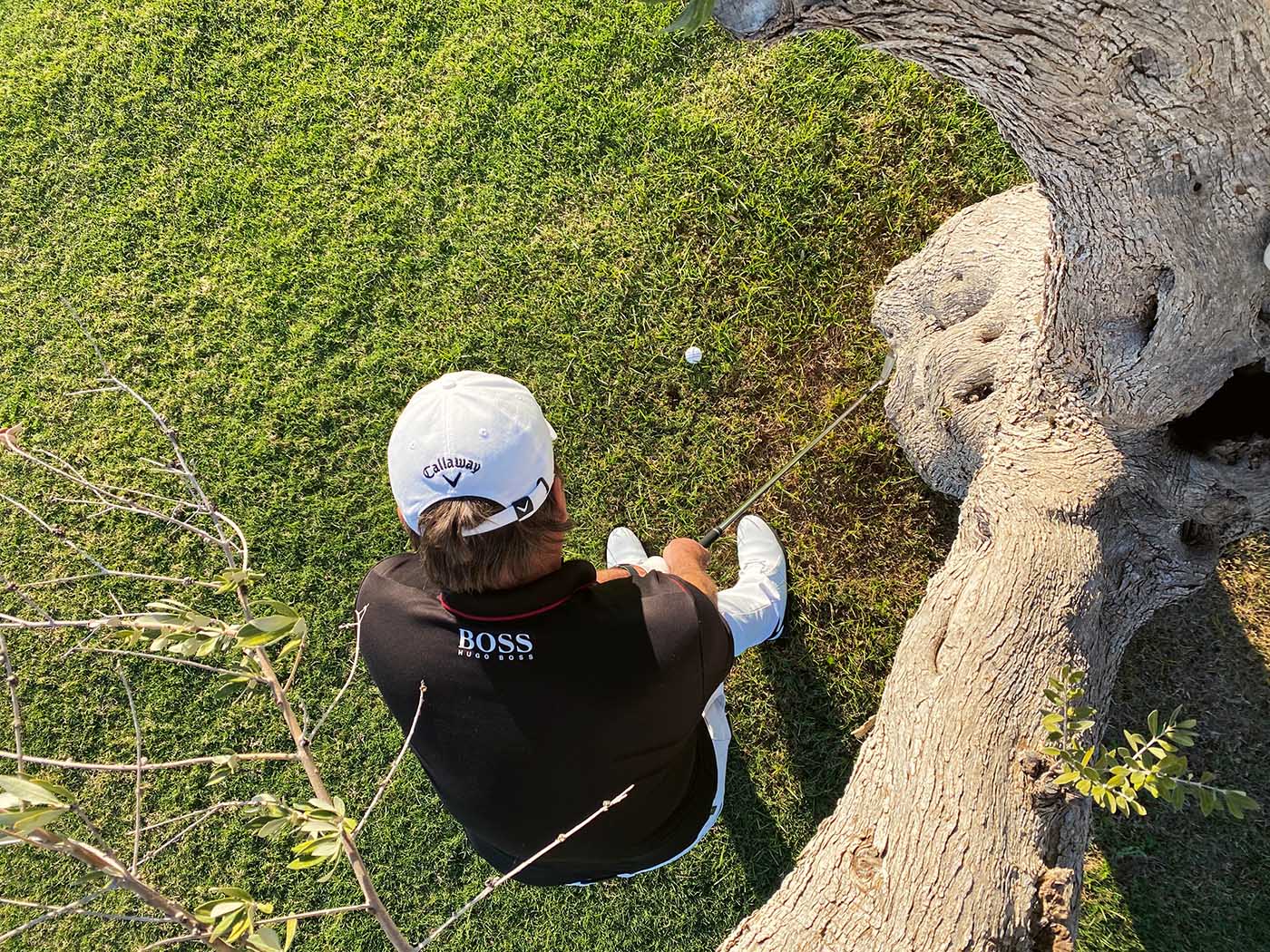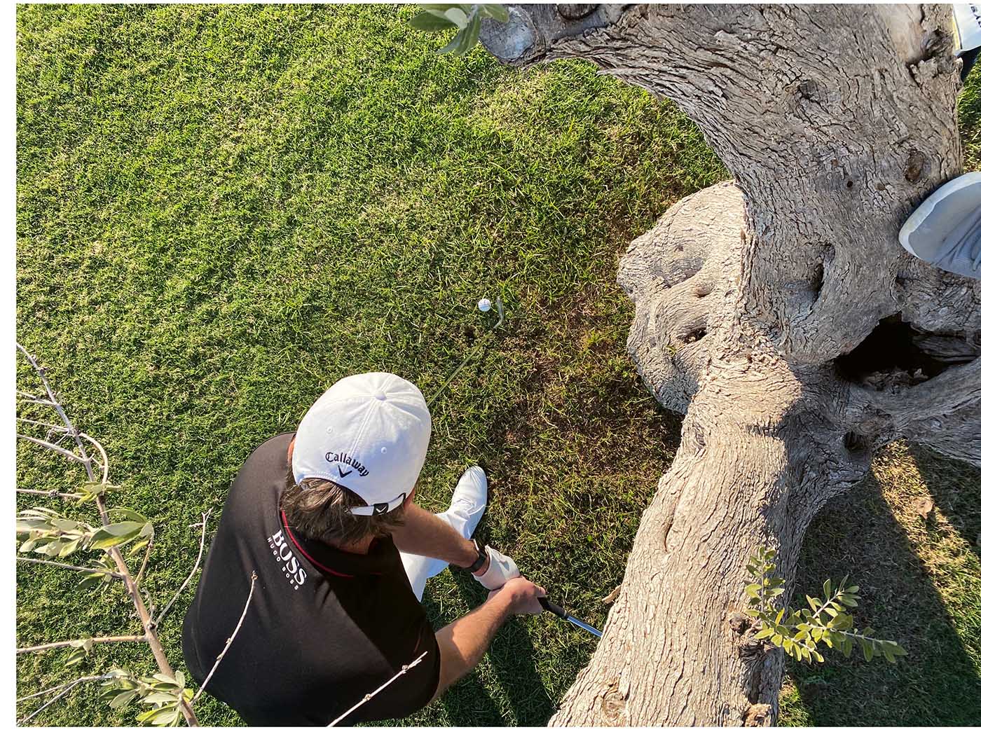 Selbst die schönsten Bäume stehen beim Golf meist im Weg. Besonders ärgerlich, wenn der Ball zwar auf gutem Untergrund liegt, ein Rückschwung auf den ersten Blick nicht möglich scheint. Hier gilt es die wichtigste Regel der Golfphysik für sich zu nutzen: Der Ball startet in die Richtung, in die Ihre Schlagfläche zeigt.