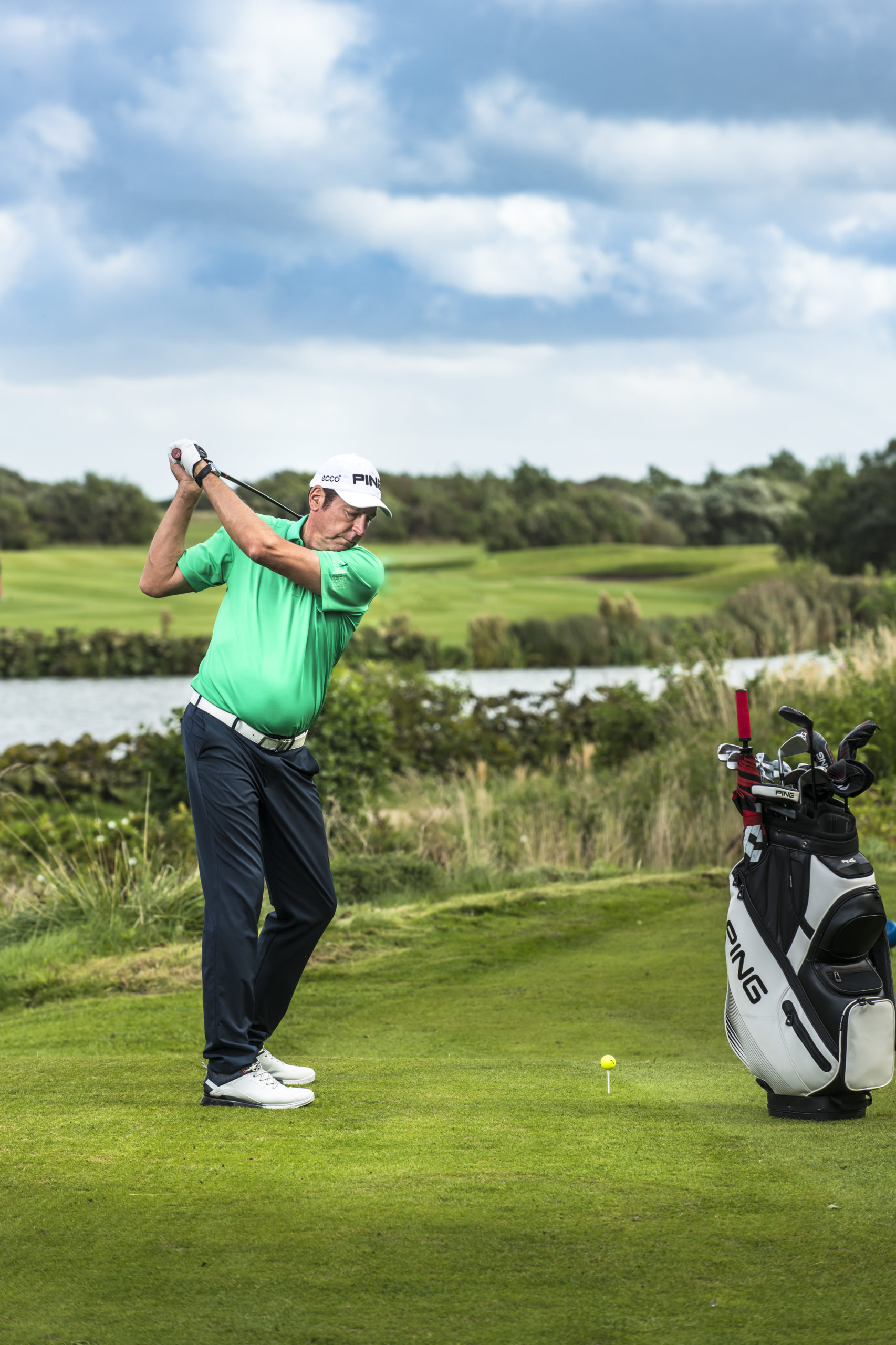 Um den Ball richtig hoch schlagen zu können, muss man ihn auch hoch aufteen. Der Ball sollte mindestens zu Zweidrittel oder sogar komplett die Krone des Drivers überragen. Dazu gibt es spezielle Tees mit einer Länge von bis zu 10 Zentimetern. Zudem stellt man in der Ansprechposition die Füße weiter auseinander und lehnt die Wirbelsäule etwas mehr nach rechts (Foto 5). Die Hände befinden sich bewusst hinter dem Ball. Beim Ausholen dreht man voll auf und schwingt die Arme weit nach oben (Foto 4). Meine Vorstellung im Durchschwung ist, dass ich den Ball in der Aufwärtsbewegung treffen möchte. Dafür sollte mein Kopf im Treffmoment hinter dem Ball sein. Hilfreich ist der Gedanke, das Tee – auch nach der Schwungsauführung – stehen lassen zu wollen.