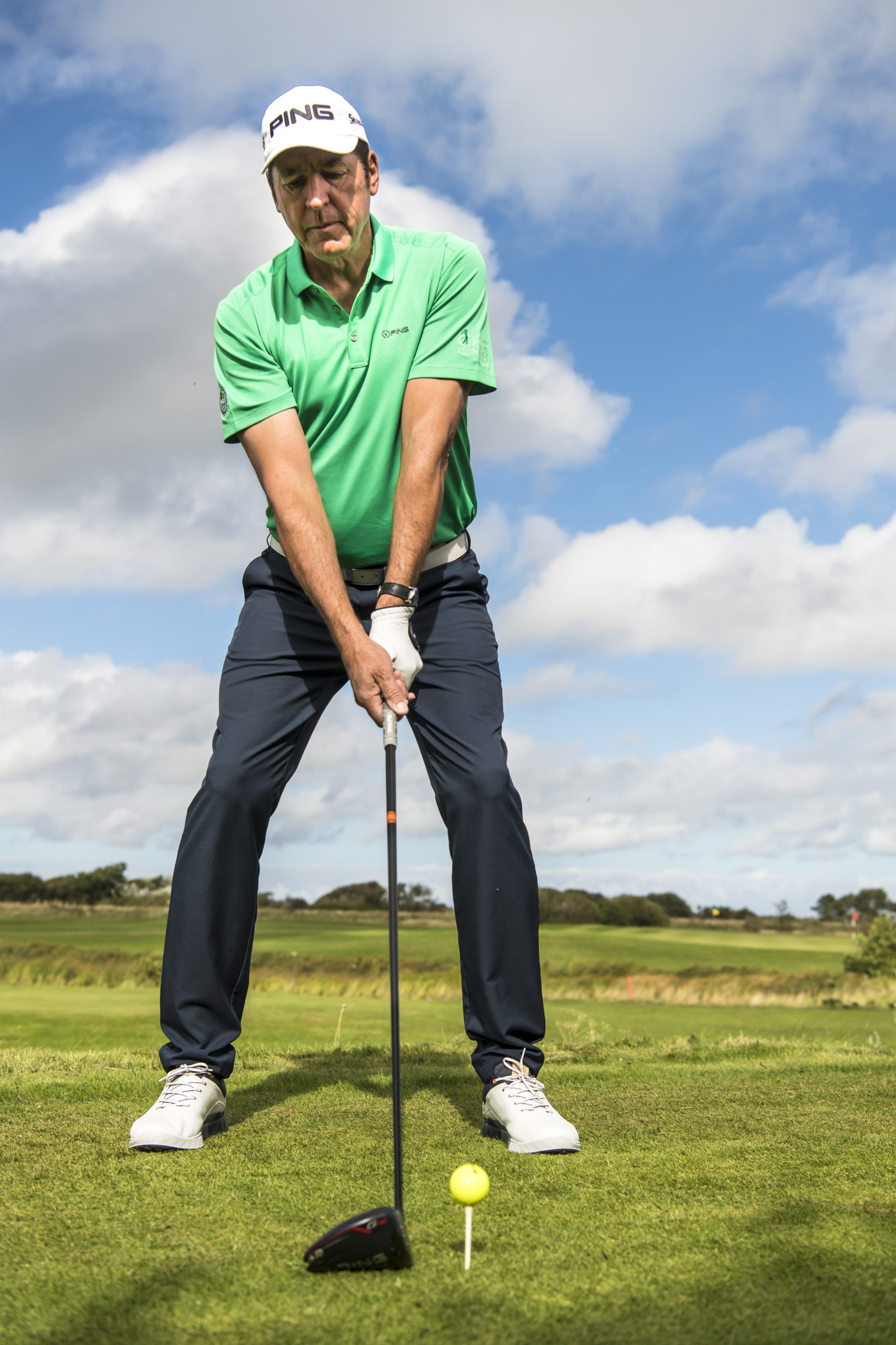 Um einen Drive flach und gerade zu schlagen, muss die Ansprechhaltung angepasst werden: Der Ball wird niedrig aufgeteet und nur leicht links der Körpermitte platziert. Das Holz 1 wird um circa 4 Zentimeter kürzer gegriffen. So trifft man den Ball nicht nur kontrollierter mit der Schlagfläche, sondern auch in der Abwärtsbewegung, was den Spinn etwas erhöht und den Ball gerader fliegen lässt. Beim Ausholen verzichtet man auf die volle Drehung und den Armeinsatz (siehe Foto 1) und schwingt mit einer leichten Bewegung von Außen nach Innen durch den Ball.