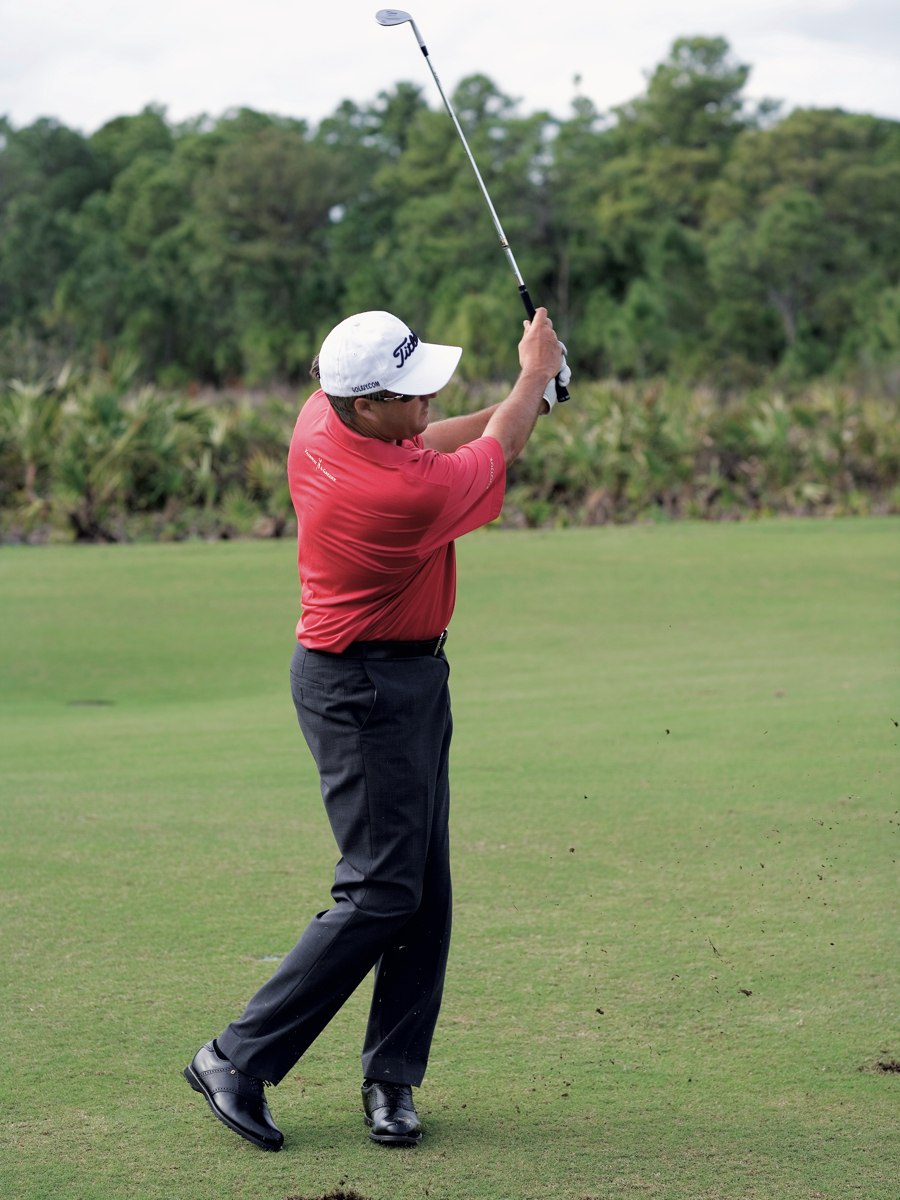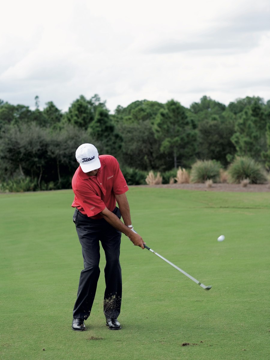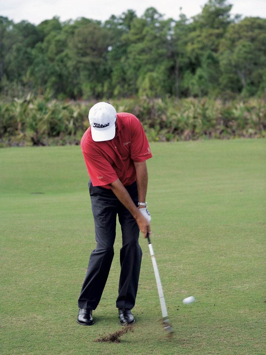 Diesen braucht man ziemlich häufig, und daher ist es besonders wichtig ihn ständig zu üben, denn wer ihn beherrscht, kann sich eine Menge Schläge sparen. Die Füße sind leicht nach links vom Ziel ausgerichtet und etwas näher zusammen als beim vollen Schlag. Um einen steileren Eintreffwinkel des Schlägerkopfes auf den Ball zu erzeugen, liegt der Ball rechts der Standmitte, und das Gewicht ist zu zirka 60 Prozent auf dem linken Bein. Wichtig ist die synchrone Bewegung von Armen und Körper.